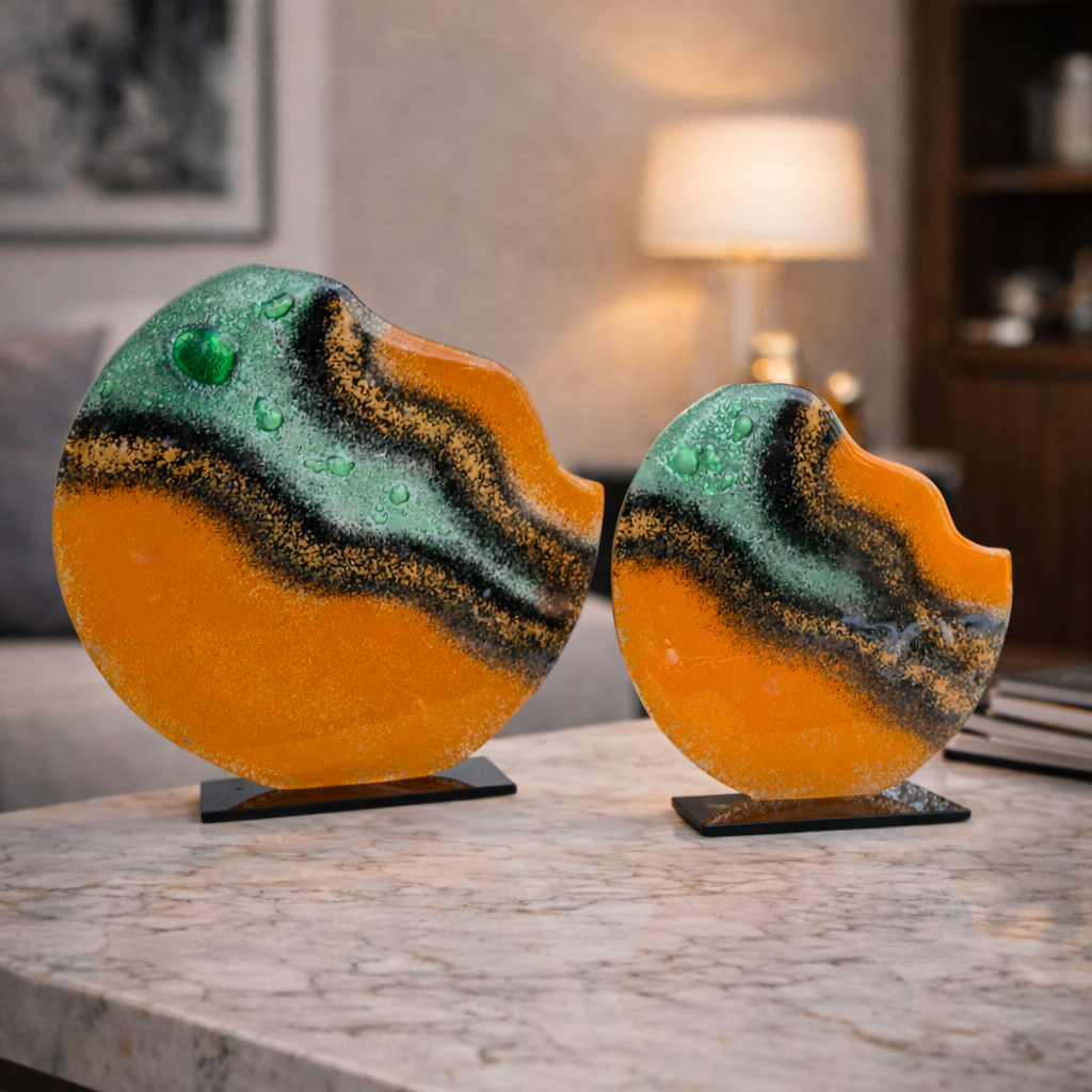 Her parça füzyon cam tekniği sayesinde kendine özgü dokular ve renk geçişleri taşıdığı için her eser benzersiz bir sanat objesine dönüşür.
