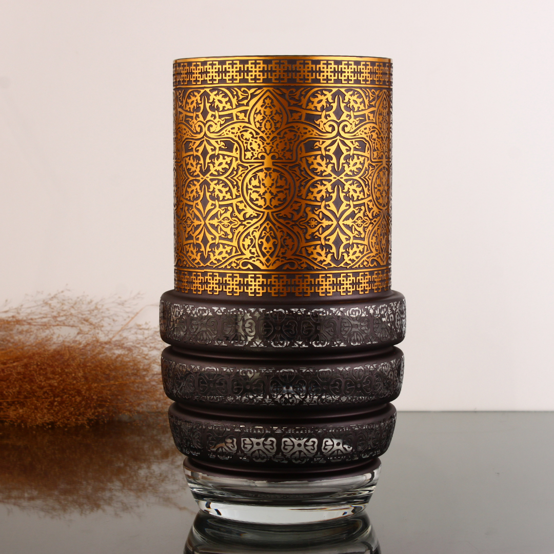 Selçuklu anıt mezar taşlarının motifleriyle tasarlanmış, el işçiliği cam vazo.