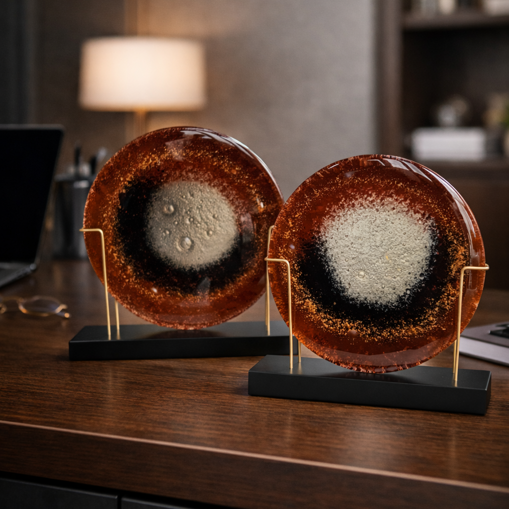 Kehribar Galaksi Füzyon Cam Dekoratif Obje Seti El işçiliği ile üretilen Ahşap Standlı Kahve Cam Disk, hem klasik hem modern mekânlarda uyum sağlayan şık bir dekoratif objedir.