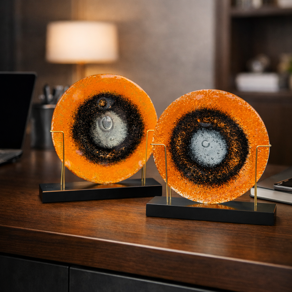 Ahşap Standlı Turuncu Cam Disk; sade ve nötr tonların hâkim olduğu alanlarda vurgu objesi olarak kullanılır. Ofis ve yaşam alanlarında enerjik bir odak noktası oluşturur.