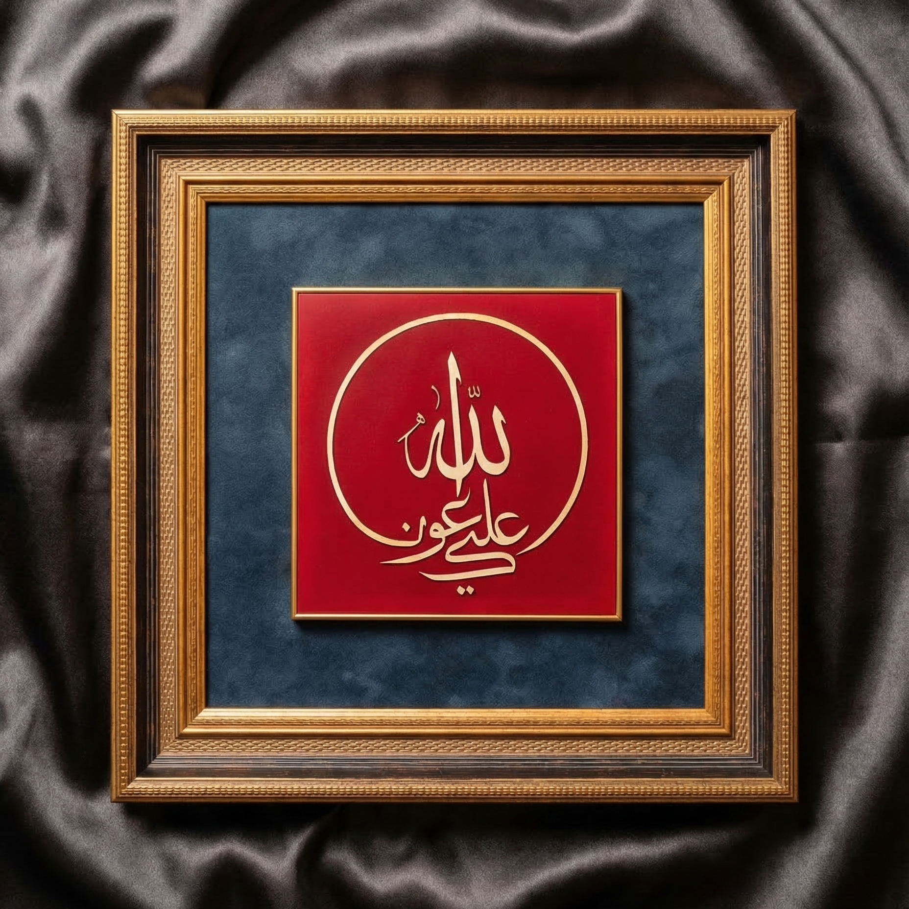Kırmızı zemin üzerinde yükselen altın tonlu hat yazısı, güçlü bir görsel kontrast oluştururken eserin manevi anlamını da vurgular. Lacivert kadife fon ve altın çerçeve detayları ise kompozisyona klasik ve ihtişamlı bir görünüm kazandırır.