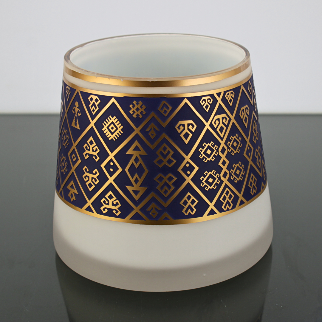 Anadolu Vazo, mat beyaz cam gövdesi üzerinde lacivert zeminli altın motif kuşağıyla Anadolu’nun kadim sembollerini modern bir dille yorumlar. Koçboynuzu, eli belinde ve hayat ağacı gibi figürler; geleneksel anlamlarını korurken çağdaş bir ritimle bir araya gelir. Anadolu Vazo Sade formu ve sembolik kuşağıyla, bulunduğu mekâna kültürel derinlik ve zarif bir duruş kazandırır.