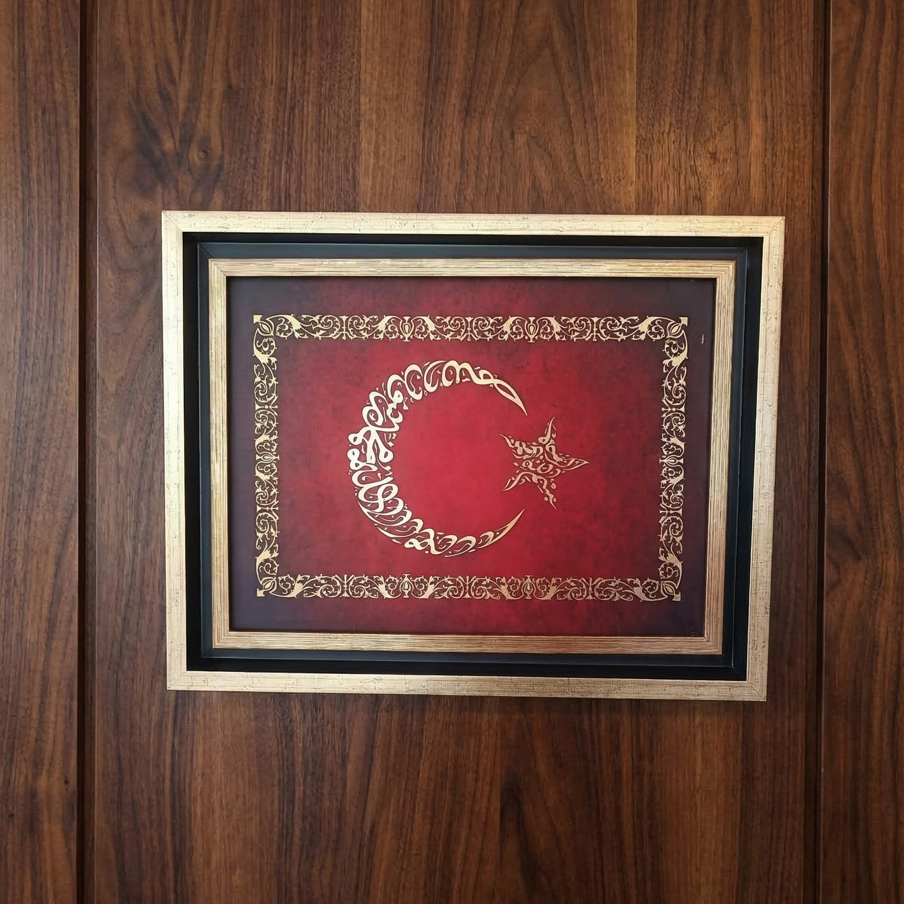 Kırmızı zemin üzerinde altın tonlu motiflerle tasarlanan eser, geleneksel tezhip bordürleriyle çevrelenerek güçlü bir kompozisyon bütünlüğü oluşturur. Sağ tarafta yer alan yıldız motifi ise tasarıma denge ve sembolik bir derinlik kazandırır.