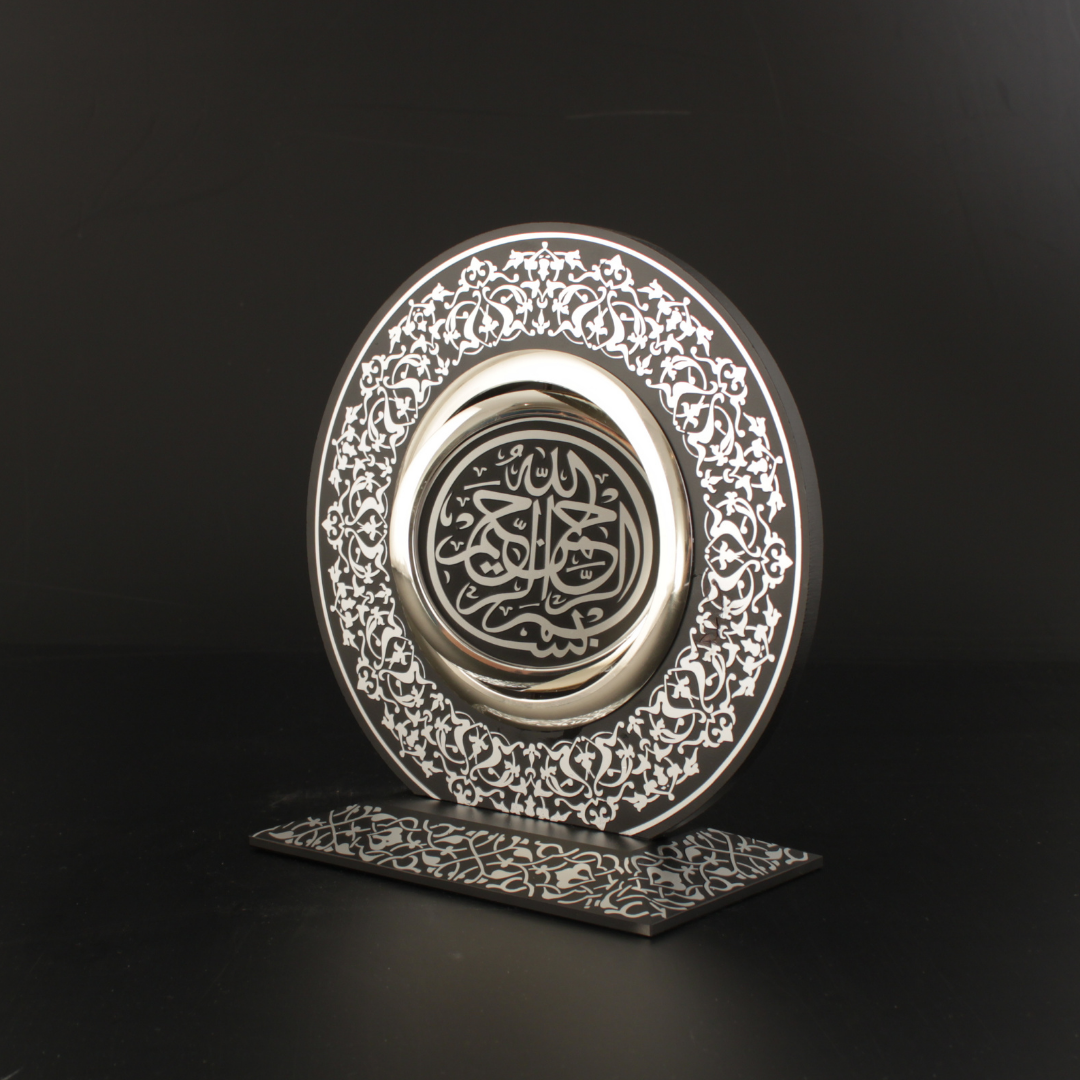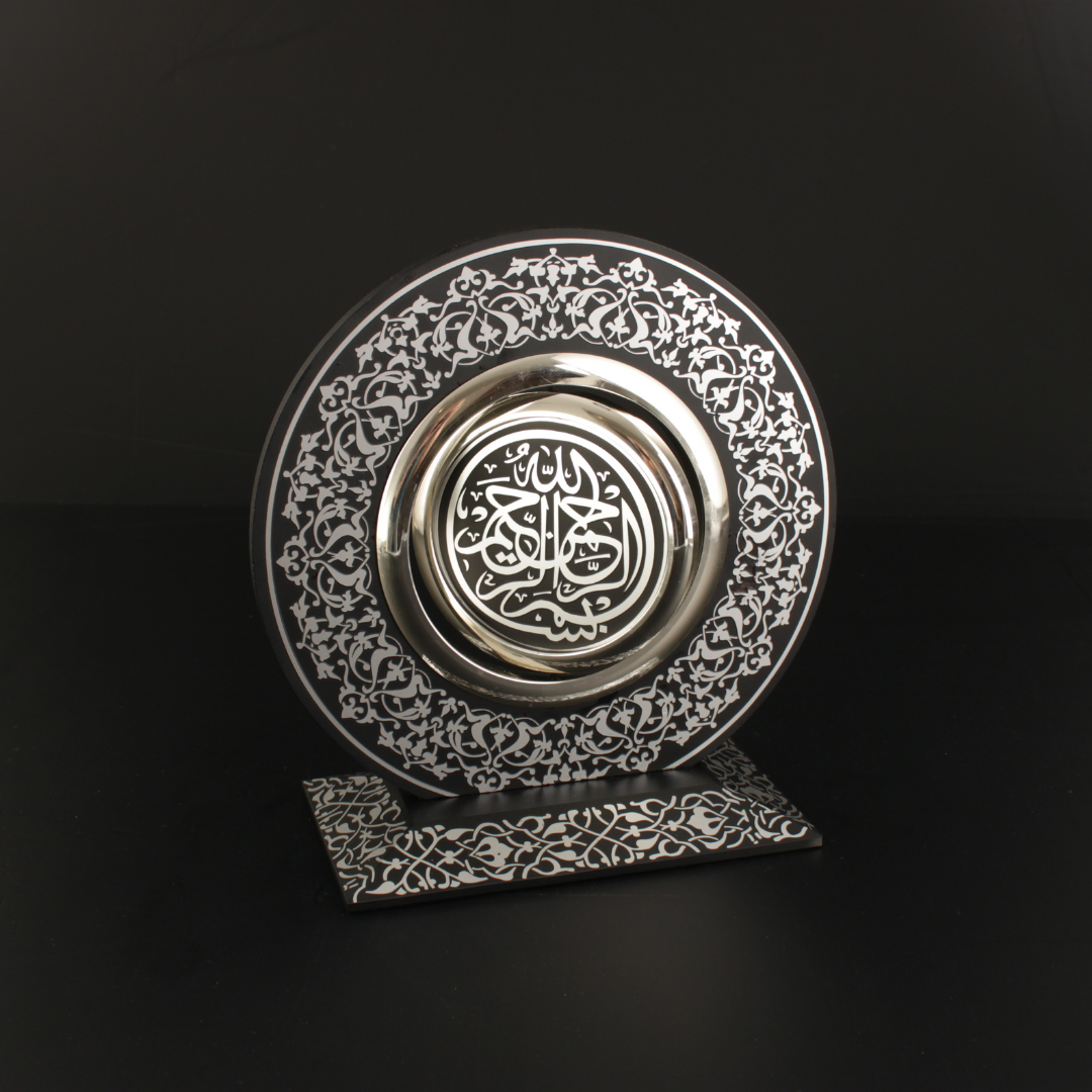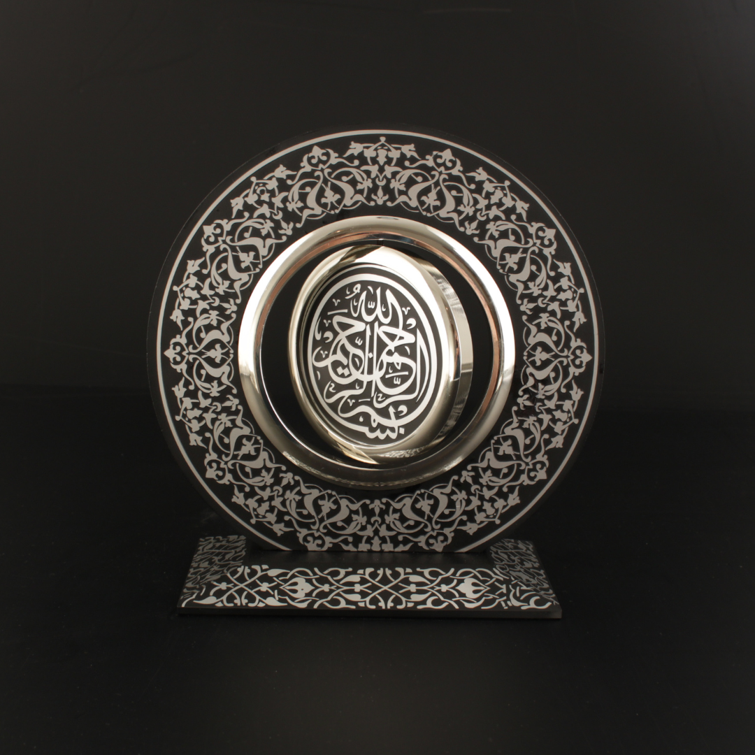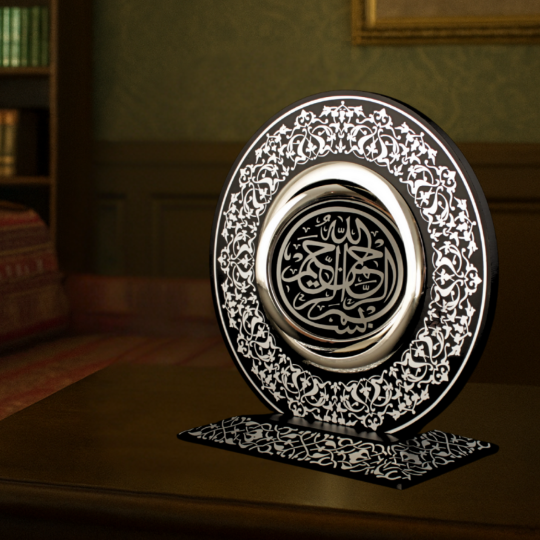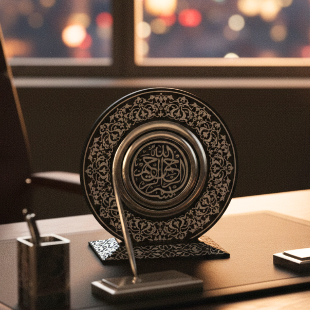 Yönetici masasında, metal mekanizma ve Besmele-i Şerif odağıyla güçlü bir temsil dili kurar. Konsolda sıcak bir aydınlatmada altın ton “fazla parlamadan” rafine görünür. Vitrinde sergilendiğinde ise rûmî motiflerin katmanı daha belirginleşir ve eser koleksiyon hissini yükseltir.