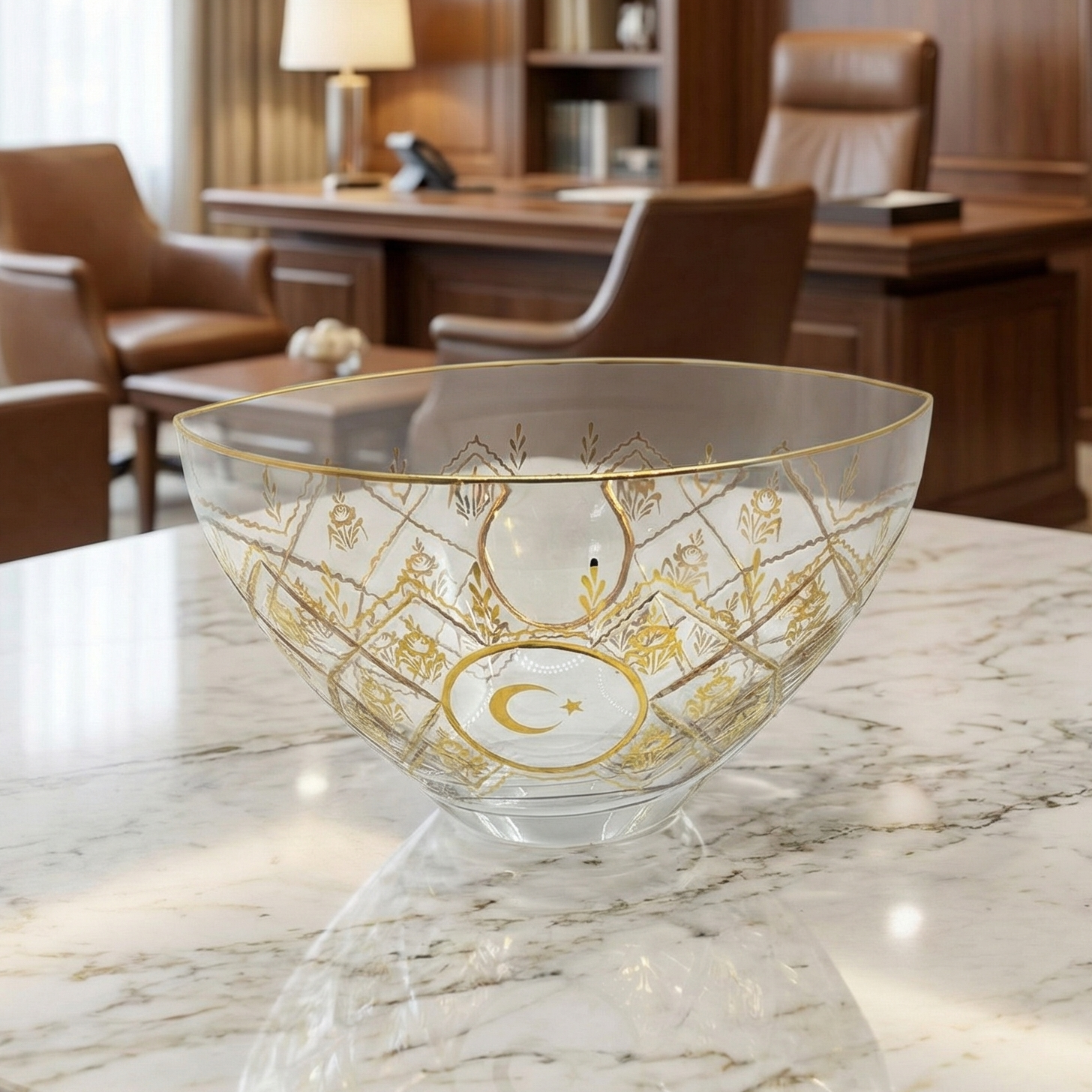 Cam yüzey üzerine el işçiliği ile uygulanan altın görünümlü detaylar, ürüne zengin ve dikkat çekici bir estetik kazandırırken; gondol formu bu tasarımı fonksiyonel bir dekoratif objeye dönüştürür. Işıkla birlikte değişen yüzey etkisi sayesinde Beykoz İşi Ay Yıldız Gondol, farklı açılarda farklı bir derinlik sunar ve mekânda güçlü bir odak noktası oluşturur.