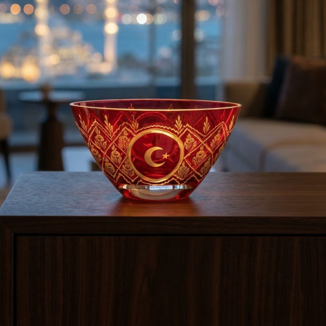 Ayyıldız motifiyle süslenmiş bu özel kase, Beykoz Cam Sanatı geleneğinden ilham alan el işçiliğiyle üretilmiş bir cam sanatı eseridir. Kırmızının derin tonu içinde beliren Ayyıldız detayı; bulunduğu alana sakin ama güçlü bir vurgu ekler, “imza parça” etkisi yaratır. Her parça atölye sürecinde el emeğiyle şekillendiği için kendine has karakter taşır; sınırlı üretimiyle koleksiyon değeri sunar; el yapımı bir Lasede tasarımı.