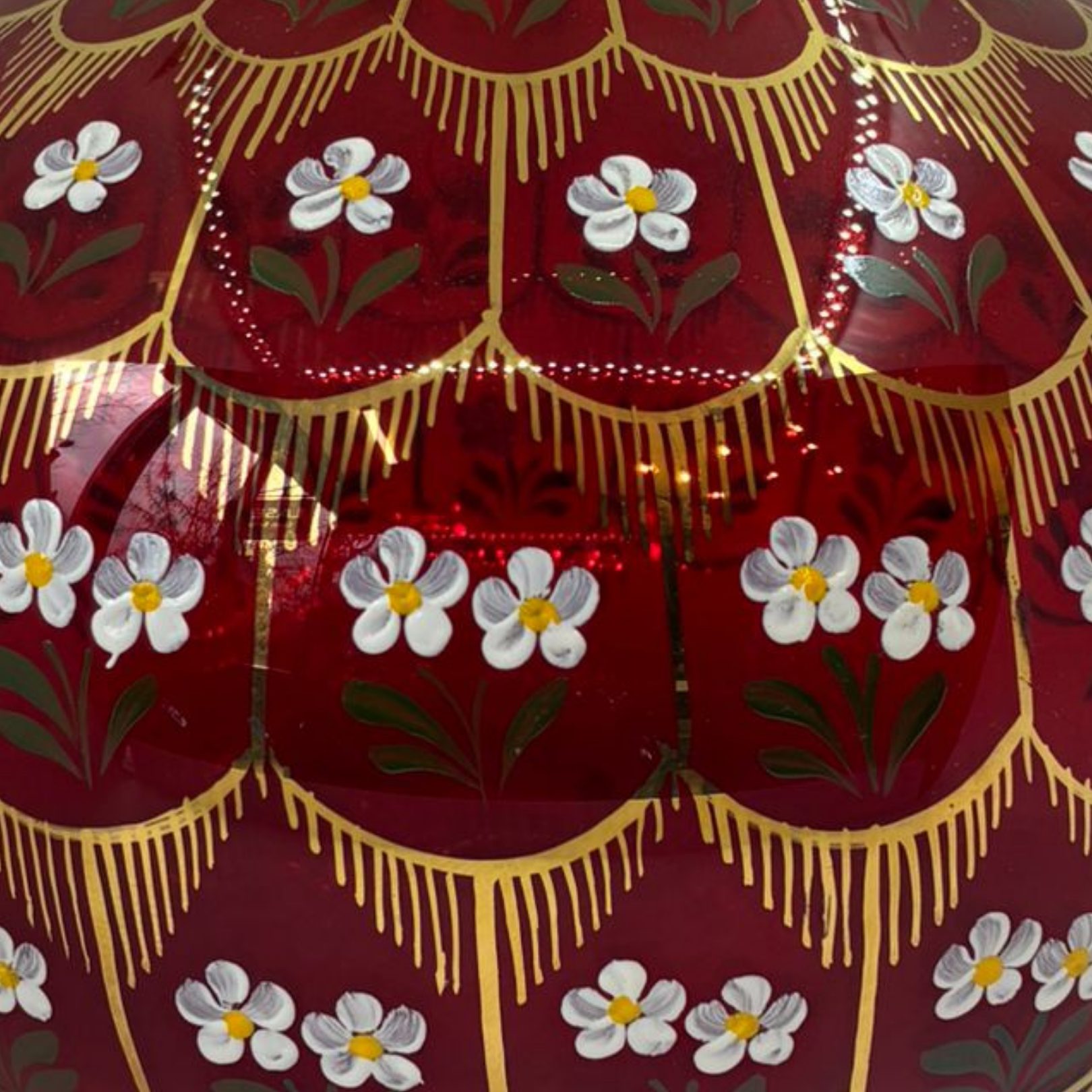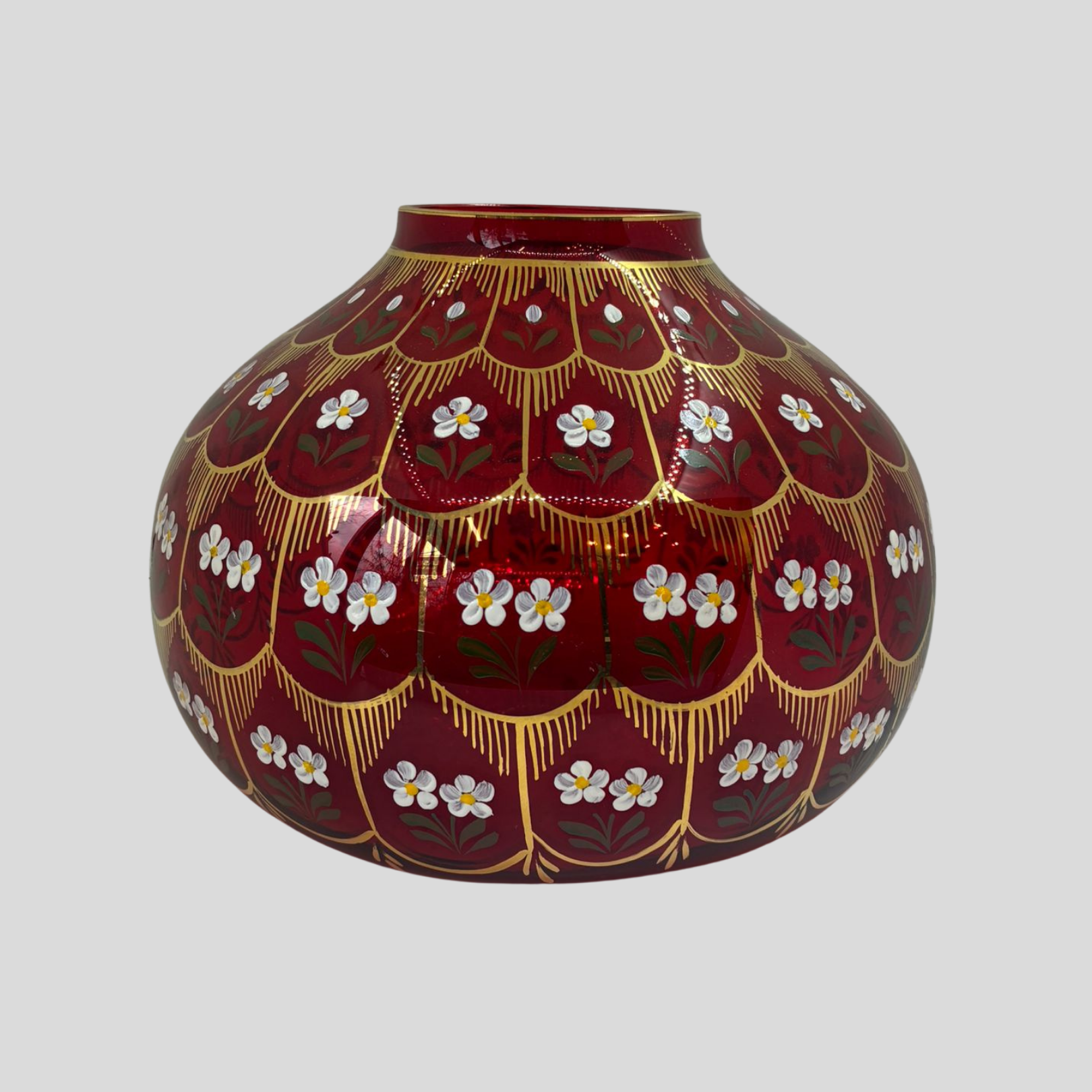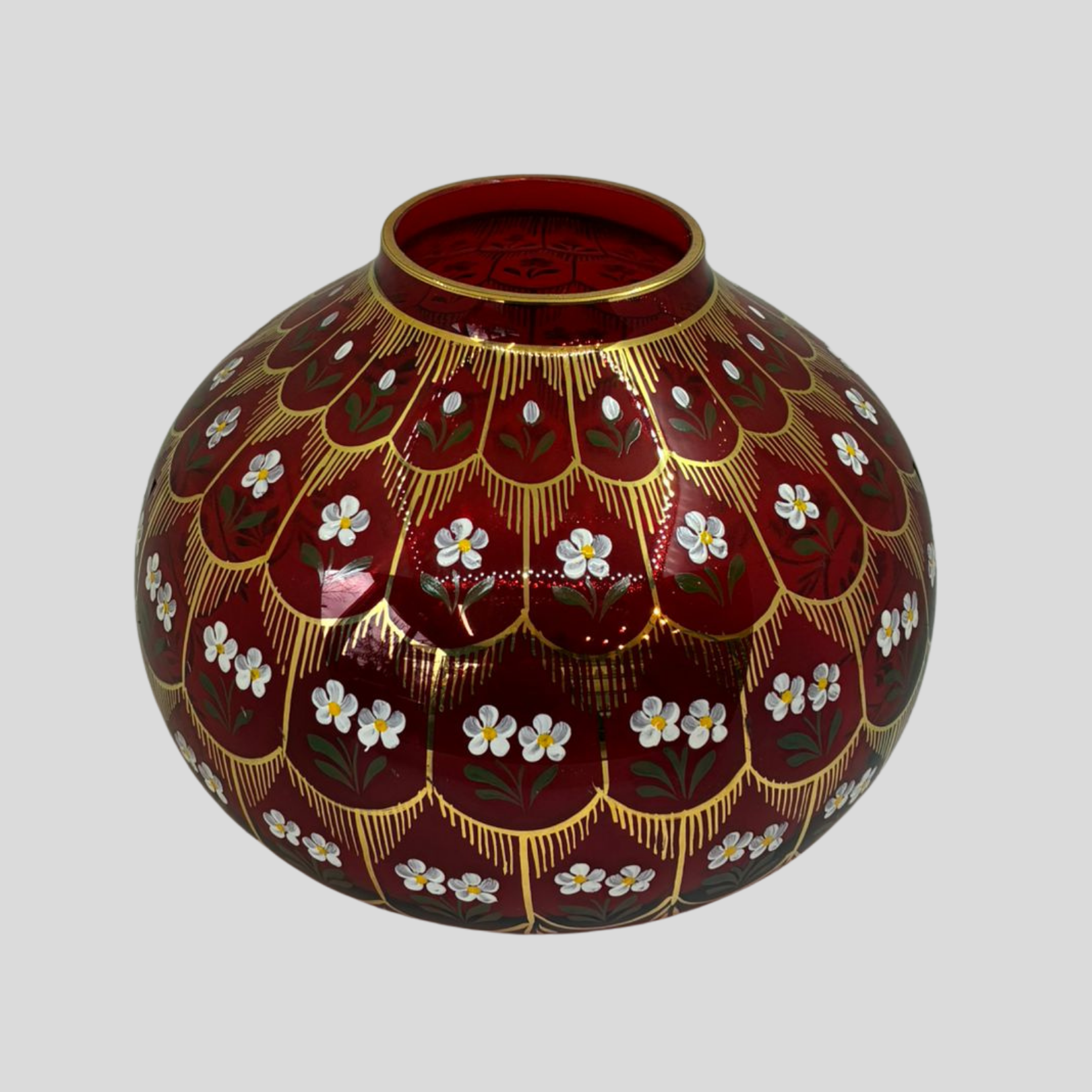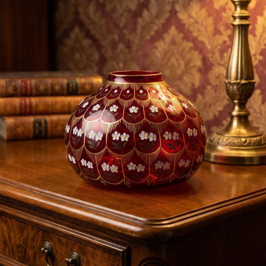 Beykoz İşi Papatya Vazo, Osmanlı cam sanatının zarafetini papatya motiflerinin naifliği ile buluşturan, el işçiliğiyle hayat bulan özel bir tasarımdır. Beykoz İşi Papatya Vazo, kırmızı camın derin ve etkileyici tonu ile altın detayların ihtişamını bir araya getirerek mekâna sıcak ve romantik bir atmosfer kazandırır.