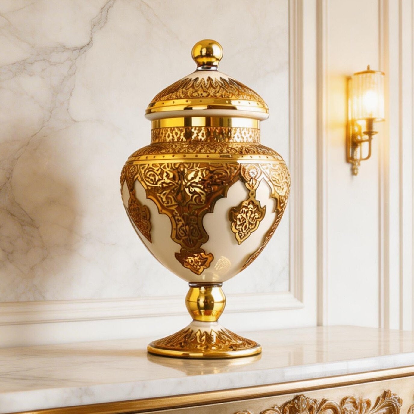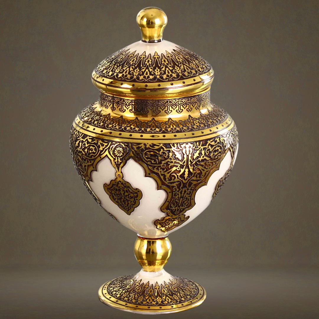 Beylerbeyi Şekerlik, İstanbul’un saray zarafetini camın ışıltısı ve altın detayların görkemiyle buluşturan seçkin bir tasarımdır. Krem zemin üzerinde yükselen yoğun altın bezemeler, esere hem güçlü hem de asil bir karakter kazandırır. Kapaklı ve ayaklı formu, klasik şekerlik siluetini daha ihtişamlı bir çizgiye taşırken; gövde boyunca işlenen saray esintili kompozisyonlar tasarıma kültürel bir derinlik ve dikkat çekici bir görsel etki katar.