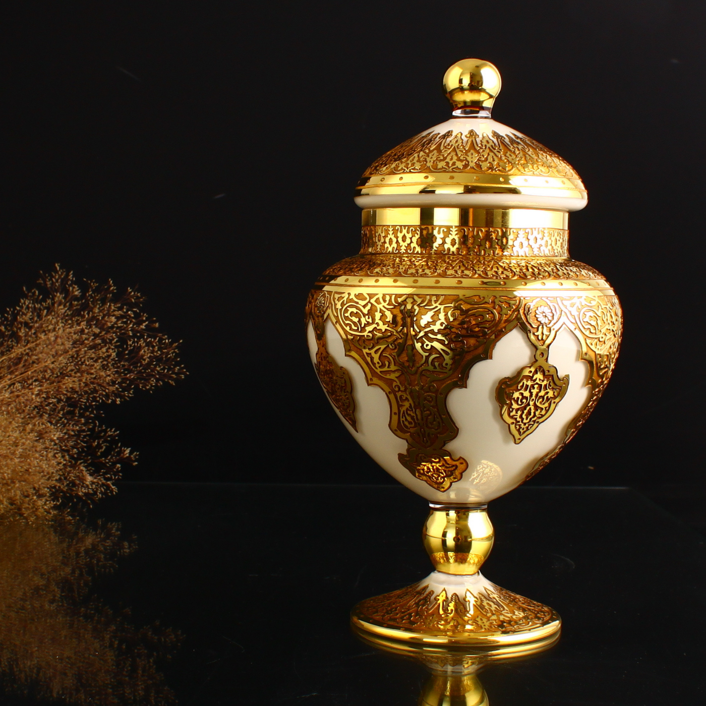 Bu ürün cam malzemeden üretilmiş olup altın detaylı dekoratif işçilikle zenginleştirilmiştir.