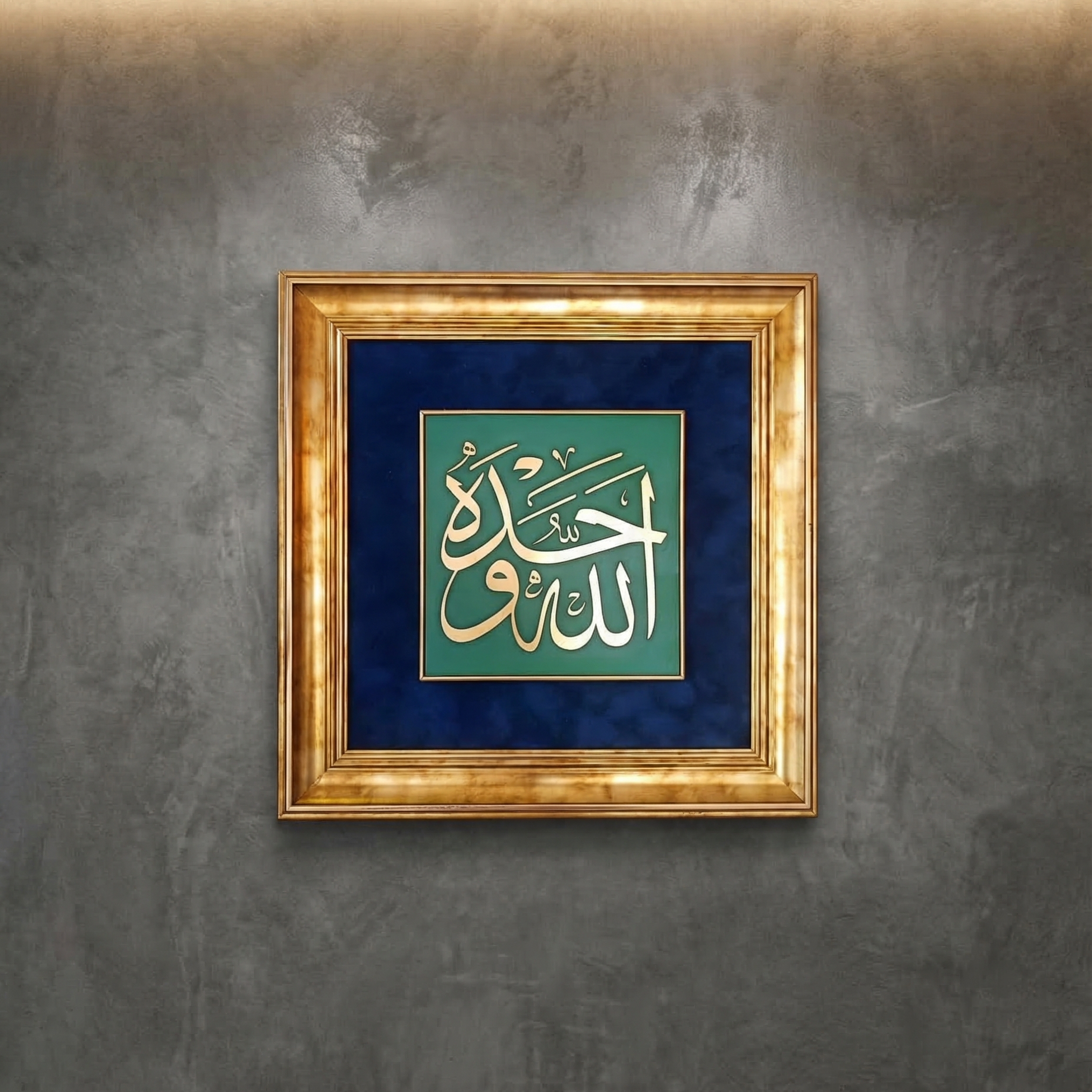 Kompozisyonun merkezinde yer alan yazı formu, klasik hat sanatının dengeli ve zarif çizgileriyle hazırlanmıştır. Turkuaz tonlu zemin üzerinde yükselen hat yazısı, lacivert kadife fon ve altın tonlu klasik çerçeve ile birleşerek esere güçlü ve ihtişamlı bir görünüm kazandırır.