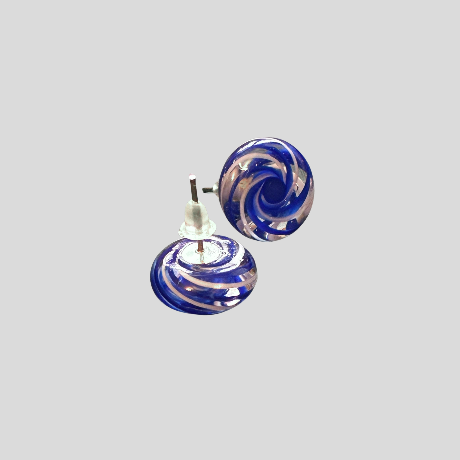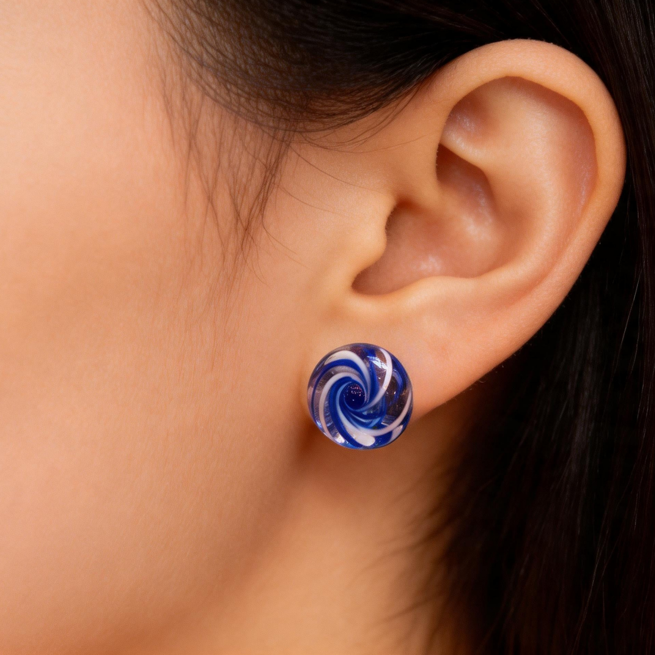 Çeşm-i Bülbül Cam Küpe, geleneksel cam sanatının zarif çizgilerini modern ve sade bir takı formunda yorumlayan özel bir aksesuardır. Lacivert cam yüzey üzerinde spiral şekilde ilerleyen beyaz çizgiler, Çeşm-i Bülbül tekniğinin akışkan estetiğini yansıtırken; yuvarlak form tasarıma dengeli, zarif ve dikkat çekici bir görünüm kazandırır.