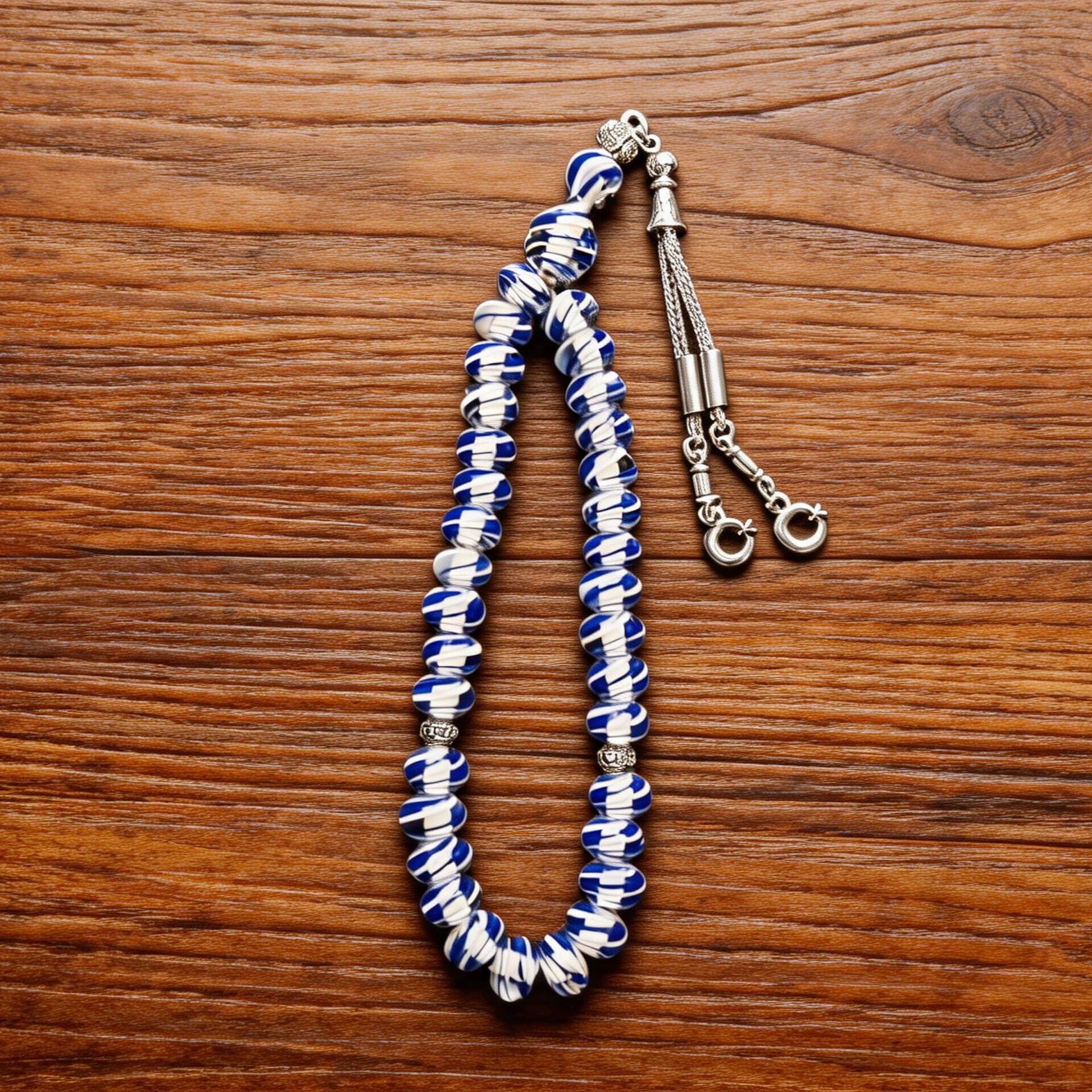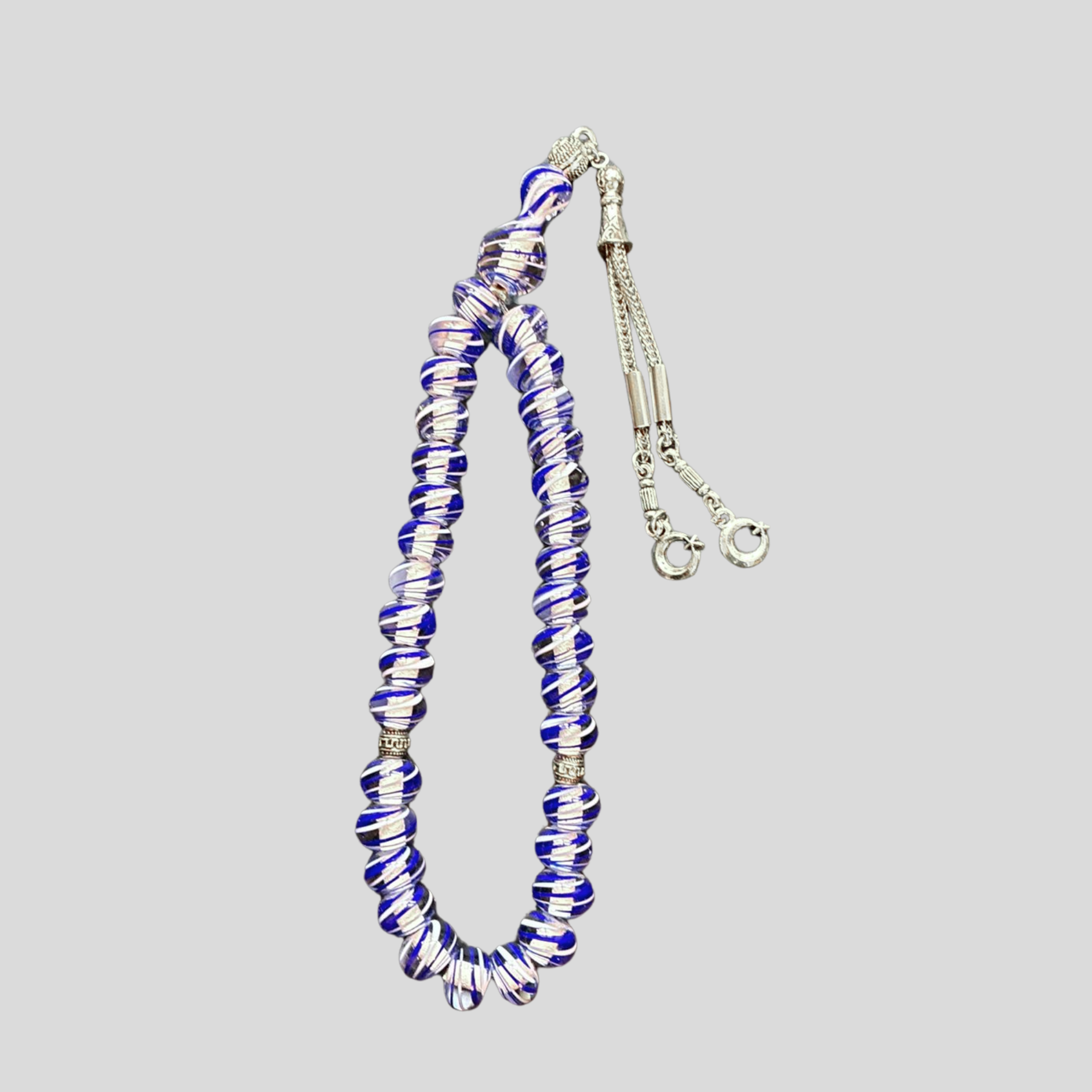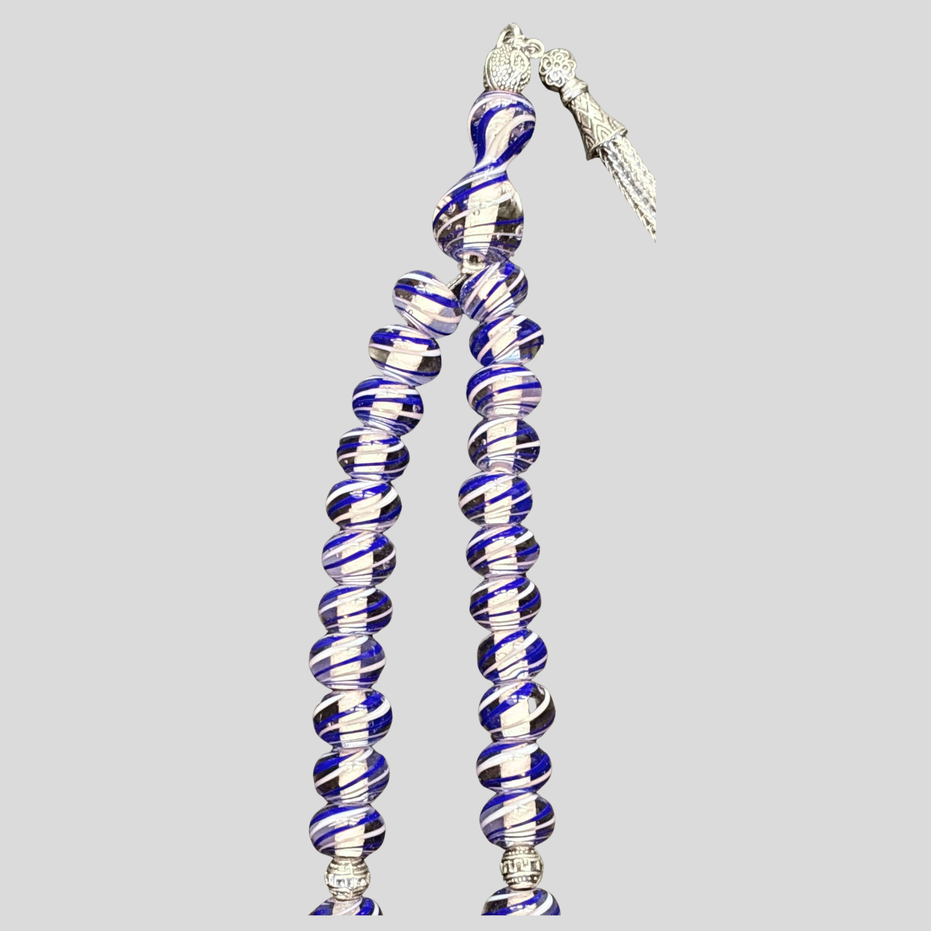 Çeşm-i Bülbül, camın içinde zarif çizgilerle hayat bulan köklü bir sanat geleneğidir. Bu tesbihte her bir cam tane, ustalığın sabrını ve camın ışıkla kurduğu estetik bağı temsil eder. Lacivert tonlar derinliği ve asaleti, beyaz çizgiler ise sadeliği ve zarafeti yansıtır.