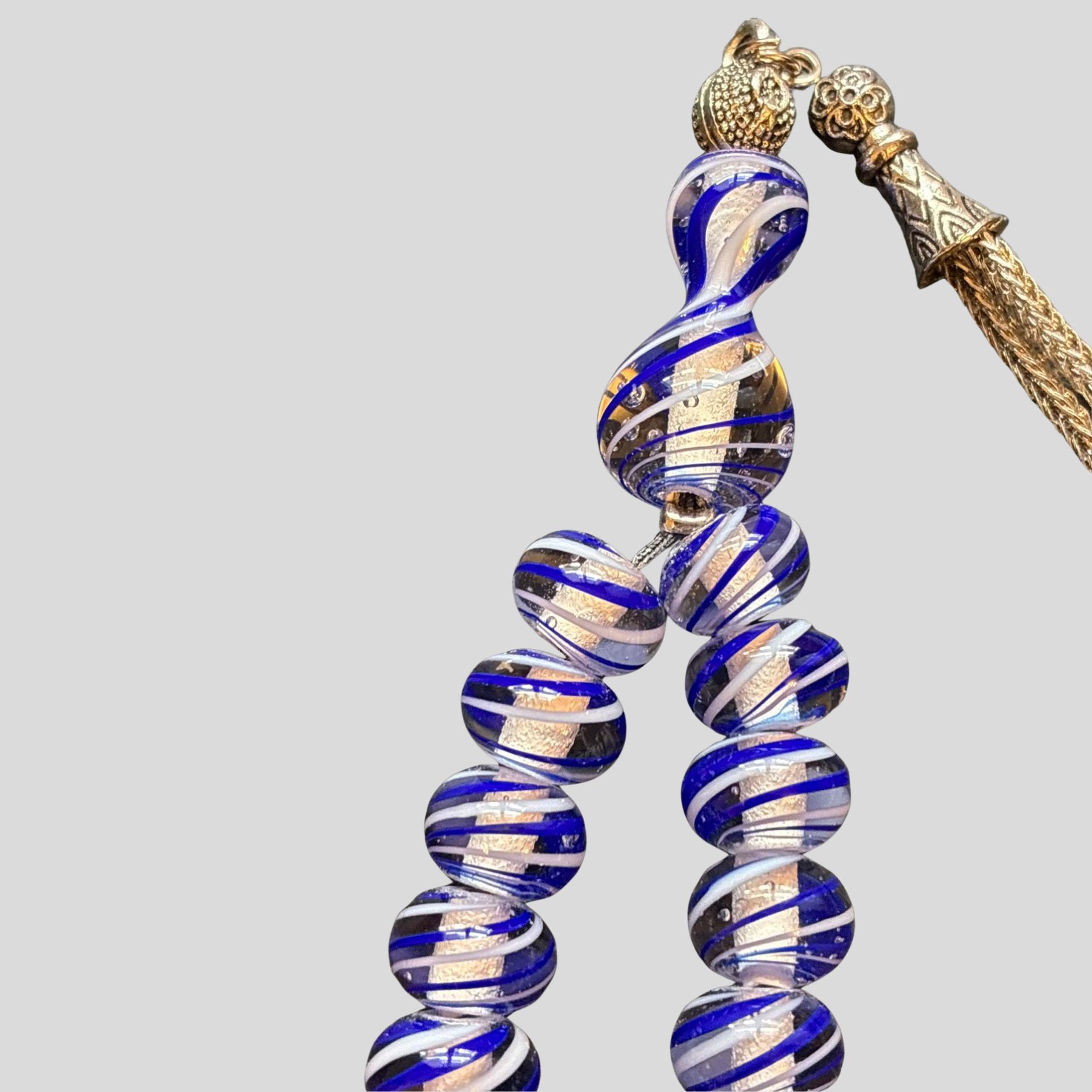 Çeşm-i Bülbül Cam Tesbih, geleneksel cam sanatının zarif çizgilerini tesbih formunda yorumlayan özel bir tasarımdır. Lacivert, beyaz ve şeffaf geçişli cam boncuklar; ışıkla birlikte derinlik kazanır ve her bir tanede Çeşm-i Bülbül tekniğinin akışkan desenleri kendini gösterir.