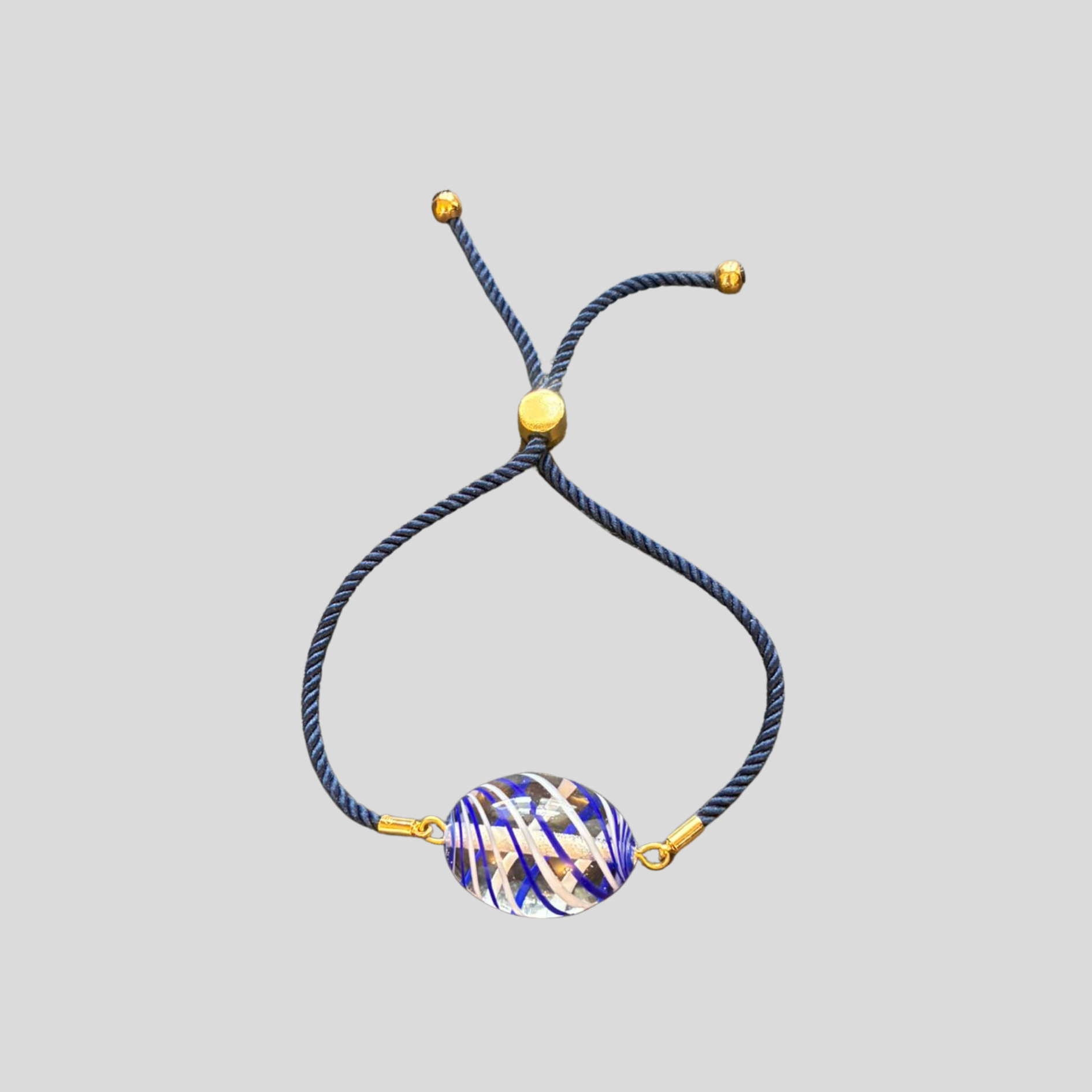 Çeşm-i Bülbül Gold Detaylı Cam Bileklik, geleneksel cam sanatının zarif çizgilerini modern bir aksesuar formunda sunan özel bir tasarımdır. Lacivert, beyaz ve şeffaf geçişlere sahip oval cam boncuk; ışıkla birlikte derinlik kazanır ve bilekte zarif bir sanat detayı gibi durur.