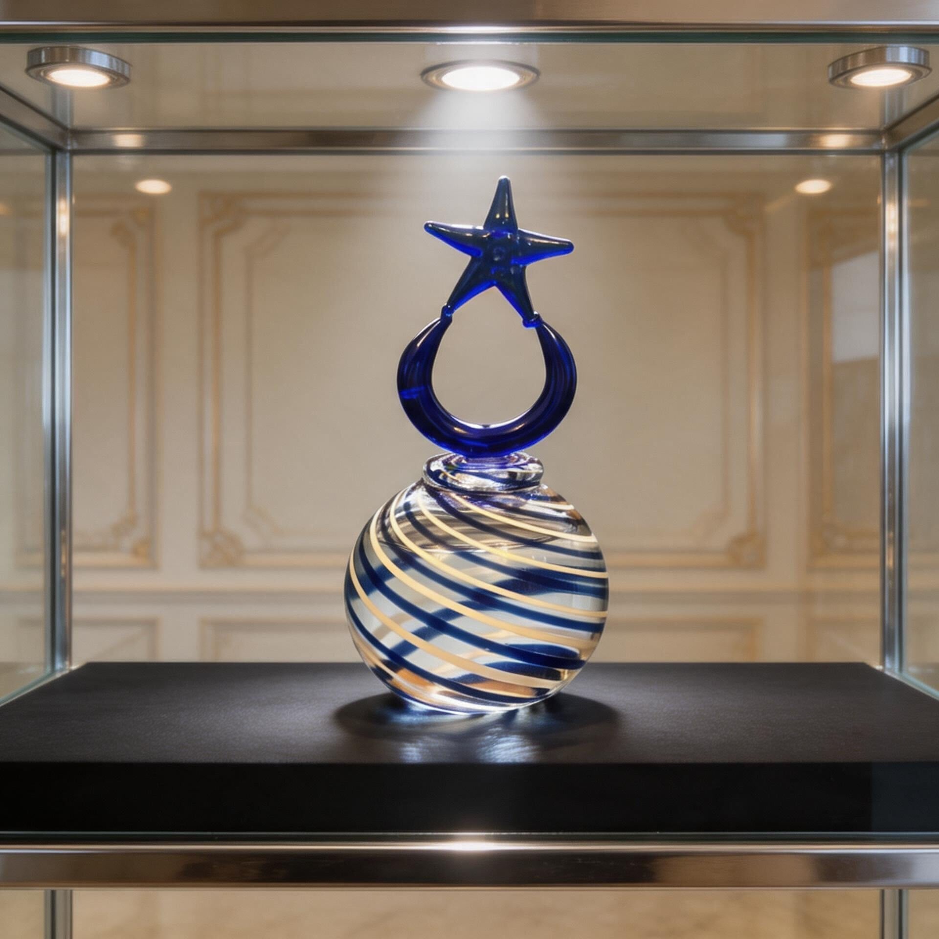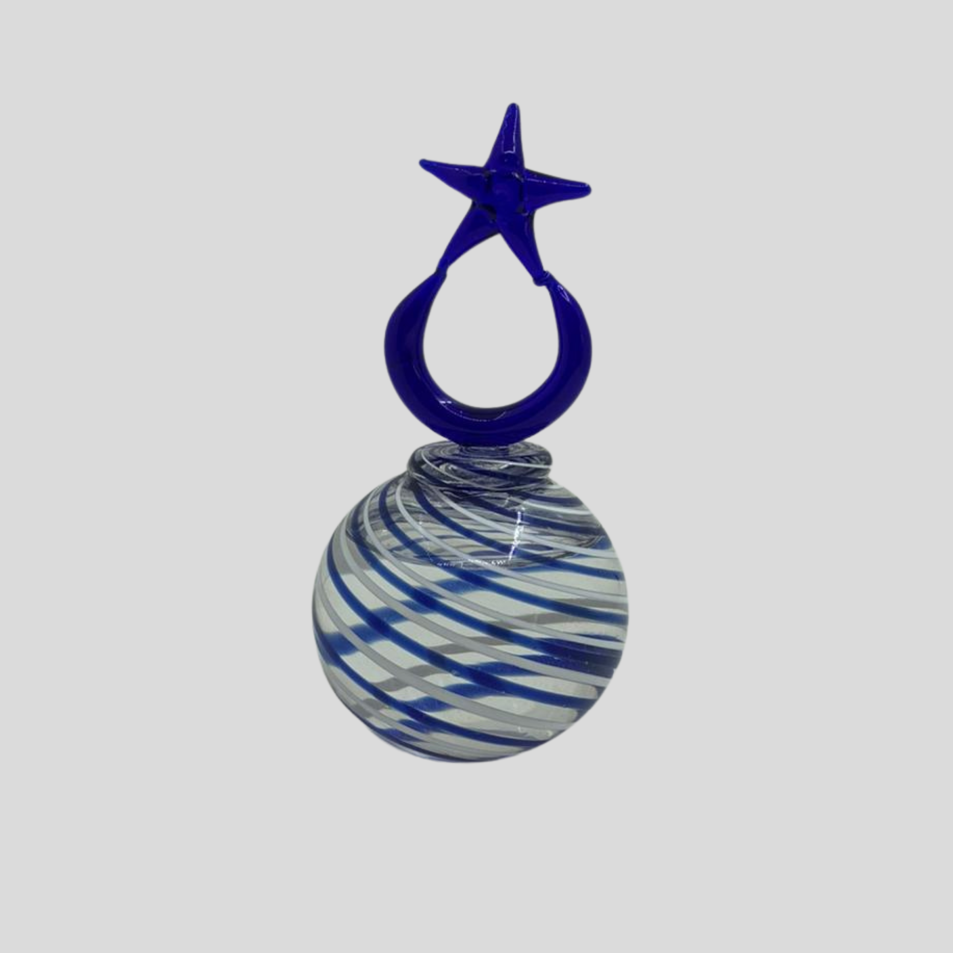Çeşmi Bülbül Masa Üstü Kağıt Ağırlığı, geleneksel cam sanatının zarafetini güçlü bir millî sembolle buluşturan özel bir masaüstü tasarımıdır. Çeşmibülbül tekniğinin akışkan mavi beyaz çizgileri, camın içindeki hareket duygusunu canlı tutarken üst bölümde yer alan ay yıldız formu bu esere yalnızca estetik değil, aynı zamanda anlam da kazandırır. Duruşundaki sadelik ve cam yüzeyin ışıkla kurduğu ilişki sayesinde ürün, küçük ölçüsüne rağmen bulunduğu alanda dikkat çekici bir etki oluşturur.