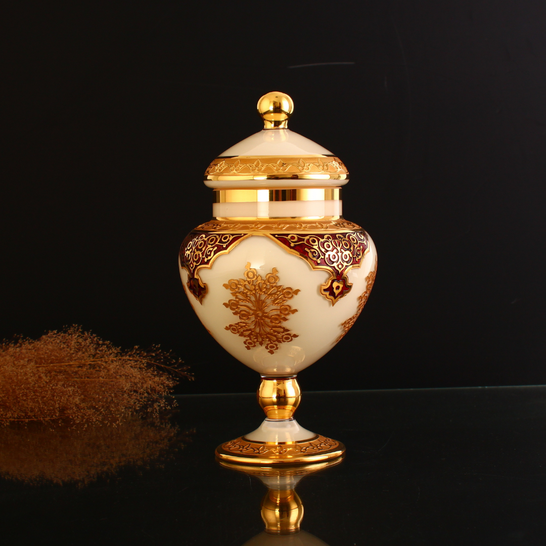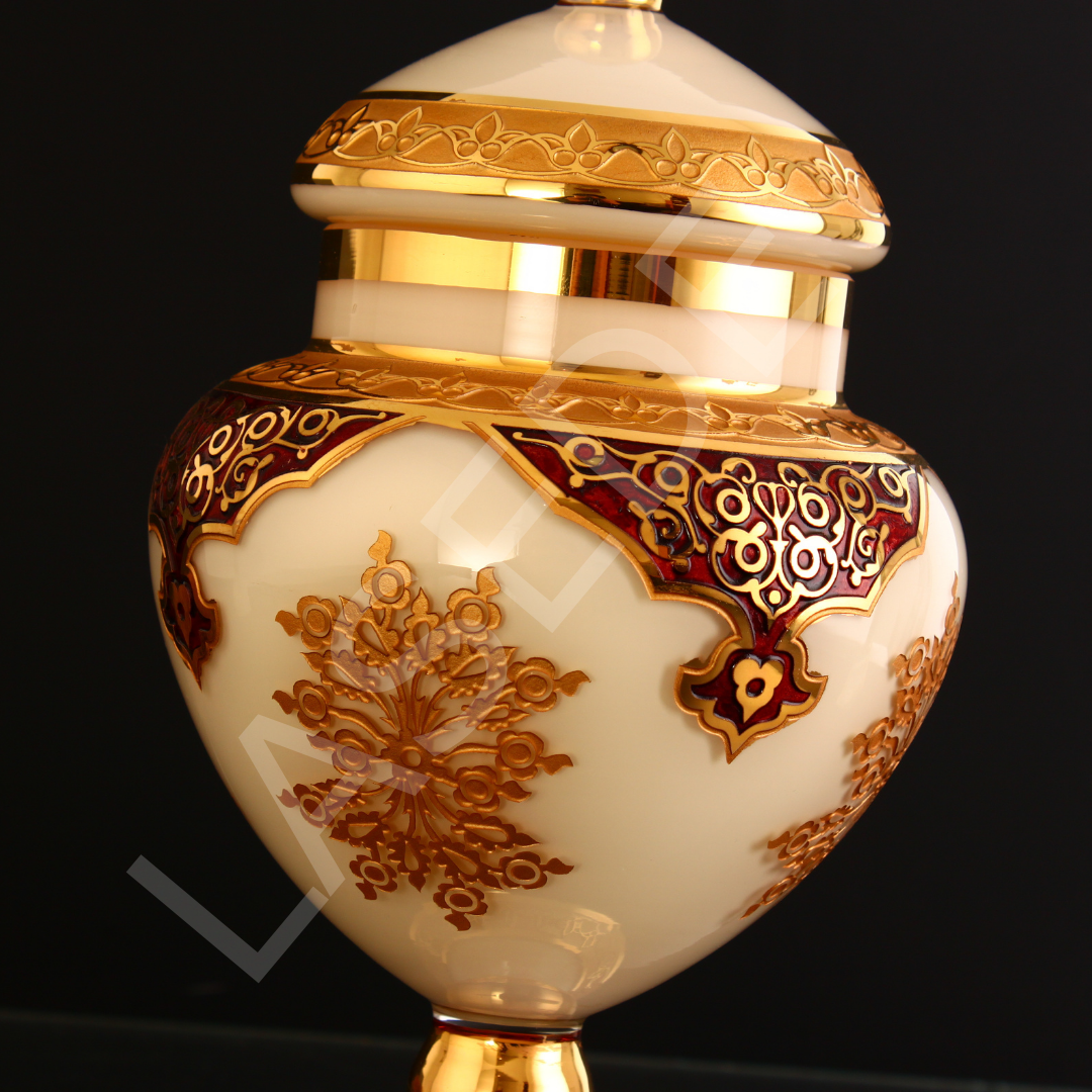 ✔ Cam yüzeyine geleneksel Osmanlı motifleri altın ve bordo tonlarında işlenmiştir.