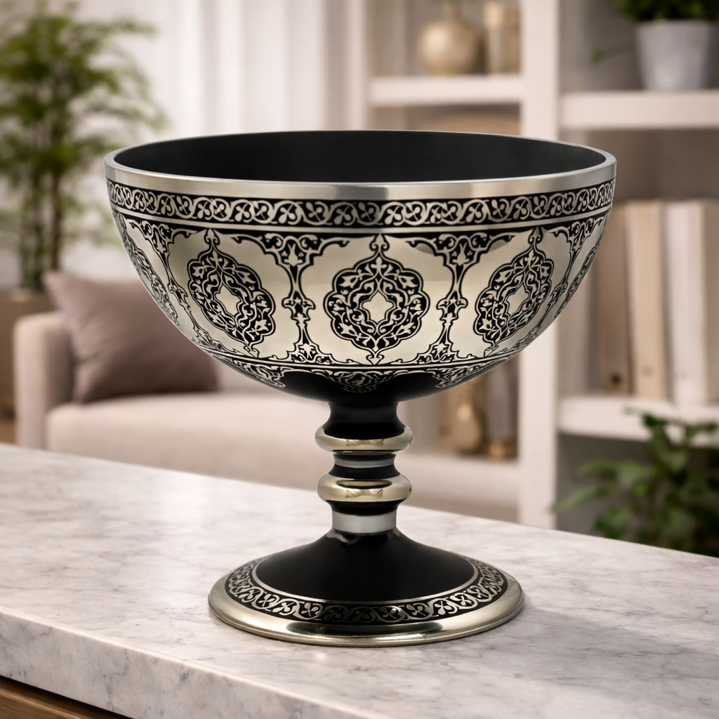 Cihari Meyvelik Platin, klasik cam sanatının estetik çizgisini modern ve dengeli bir form ile buluşturan, güçlü bir dekoratif tamamlayıcıdır. Cihari Meyvelik Platin, platin görünümlü işleme detayları ve siyah yüzeyin kontrast uyumuyla bulunduğu mekâna rafine bir şıklık kazandırır.