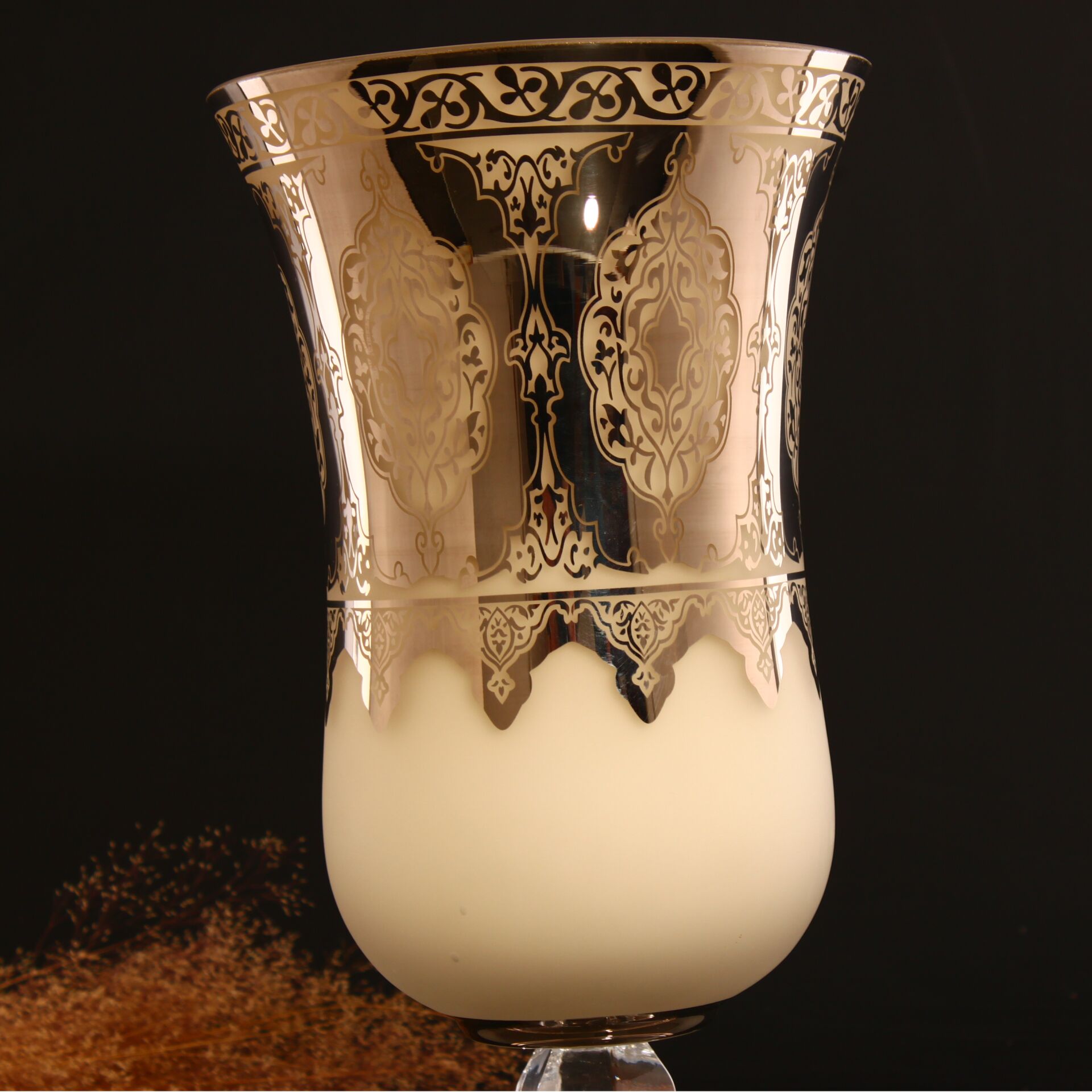 Cihari Vazo, klasik cam sanatının zarif formunu modern lüks anlayışıyla buluşturan, sade ama etkileyici bir tasarımdır. Cihari Vazo, beyaz iç yüzeyin yumuşak tonu ile platin desenlerin ince işçiliğini bir araya getirerek bulunduğu mekâna rafine bir şıklık kazandırır.