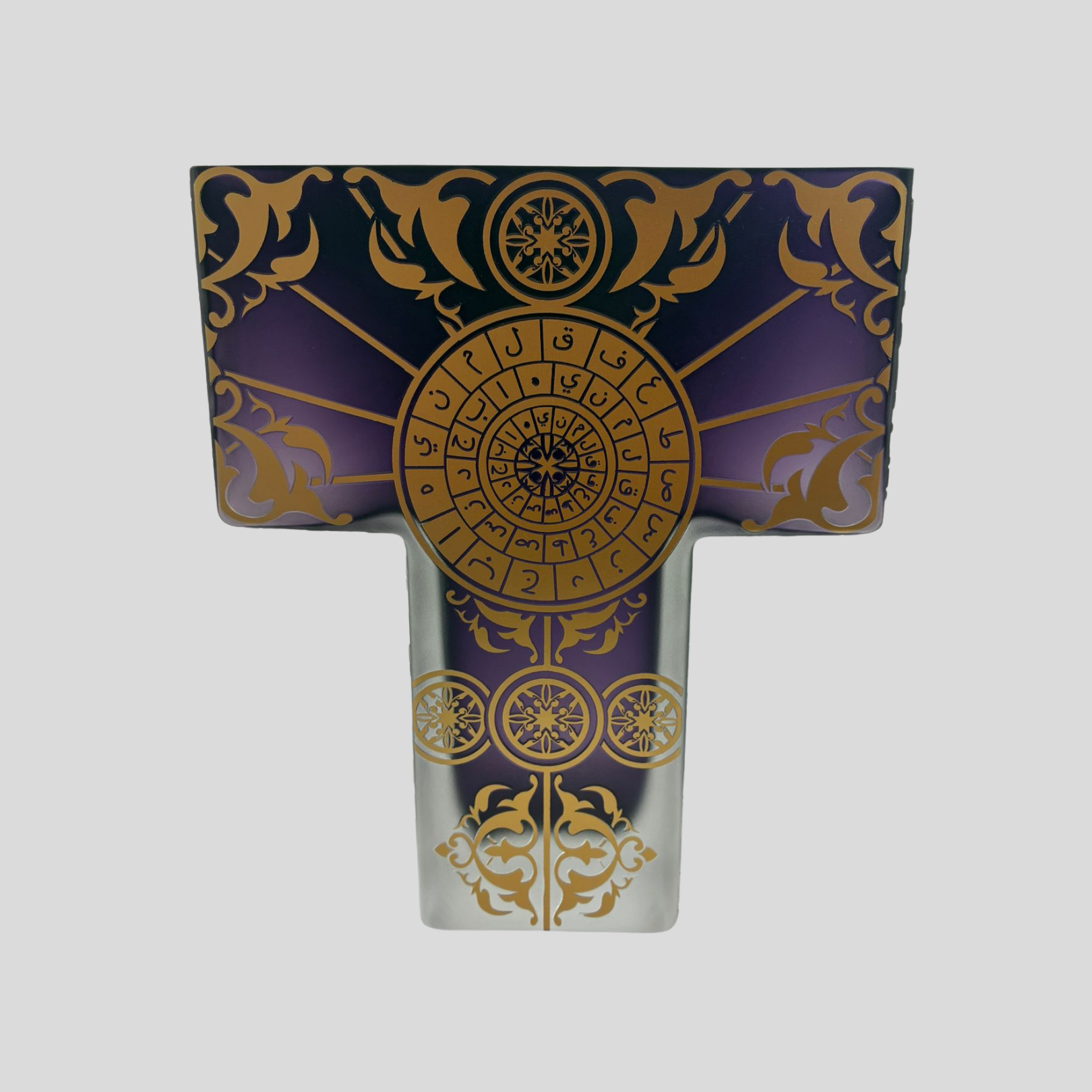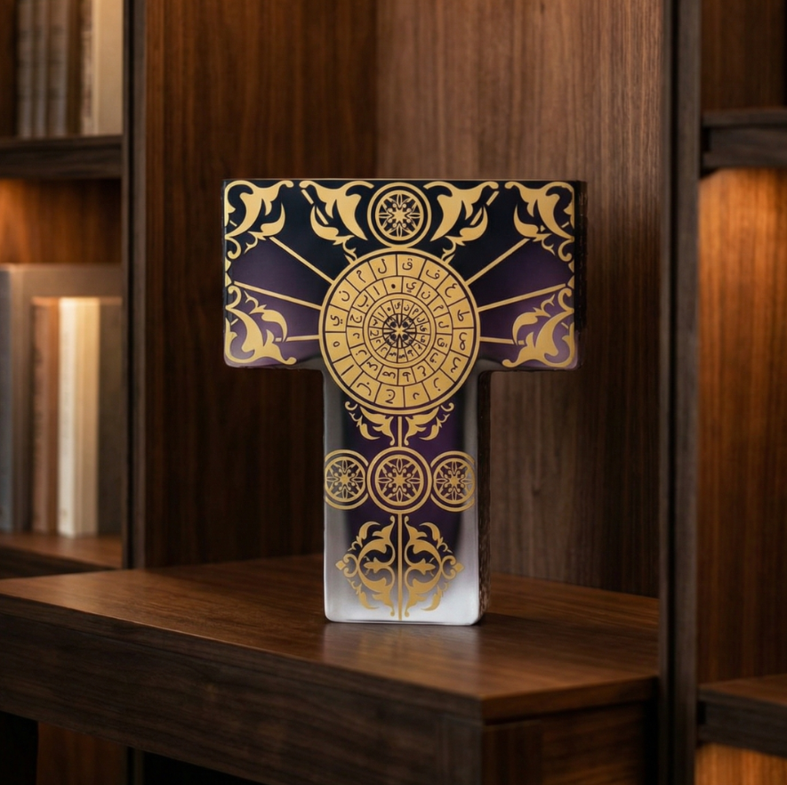 Mor ve altın tonlarının dengeli kullanımı, esere hem derinlik hem de zarif bir ihtişam kazandırır. Geleneksel motiflerle modern cam formunun birleştiği bu tasarım, geçmişin bilim mirasını günümüz sanat diliyle yorumlayan dikkat çekici bir dekoratif eserdir.