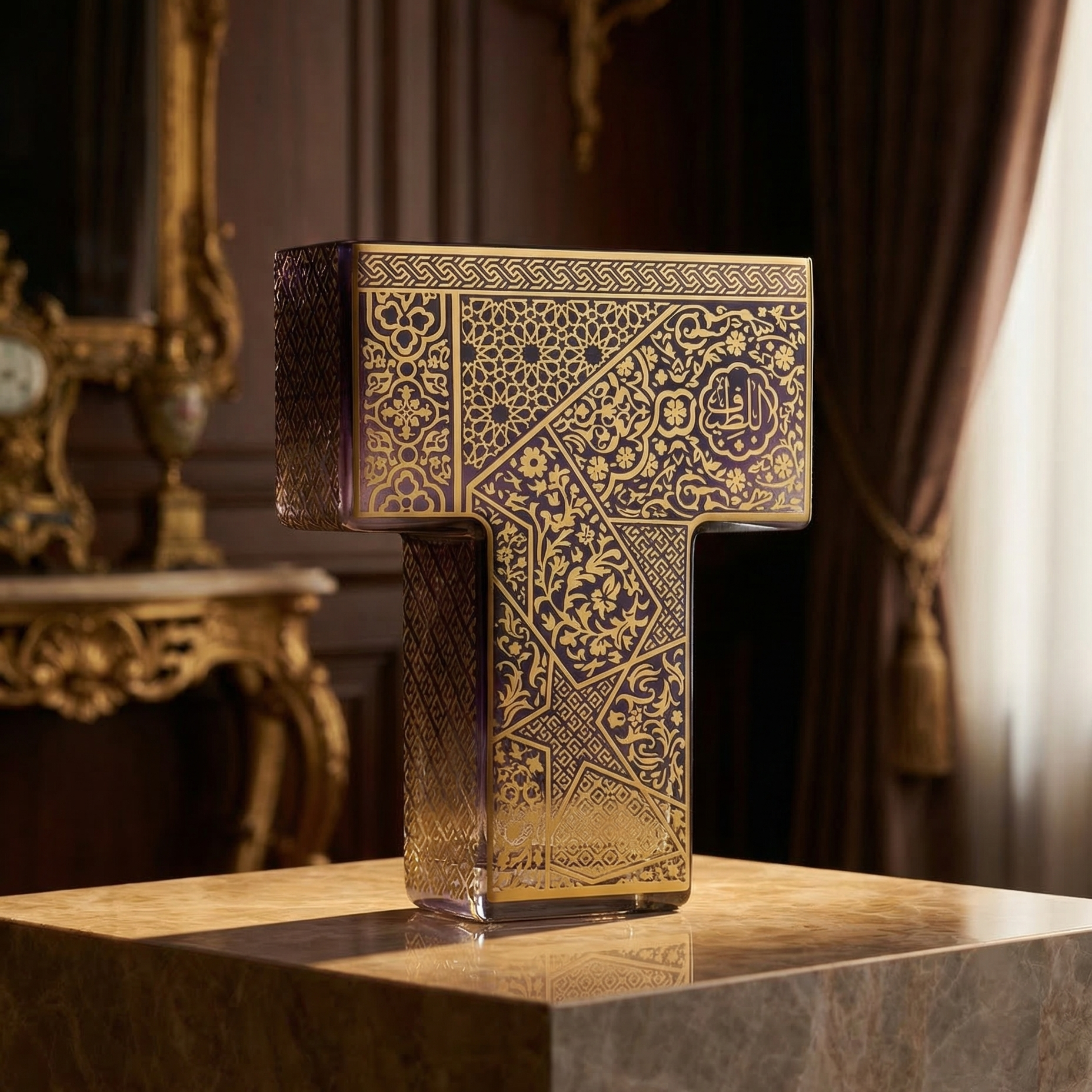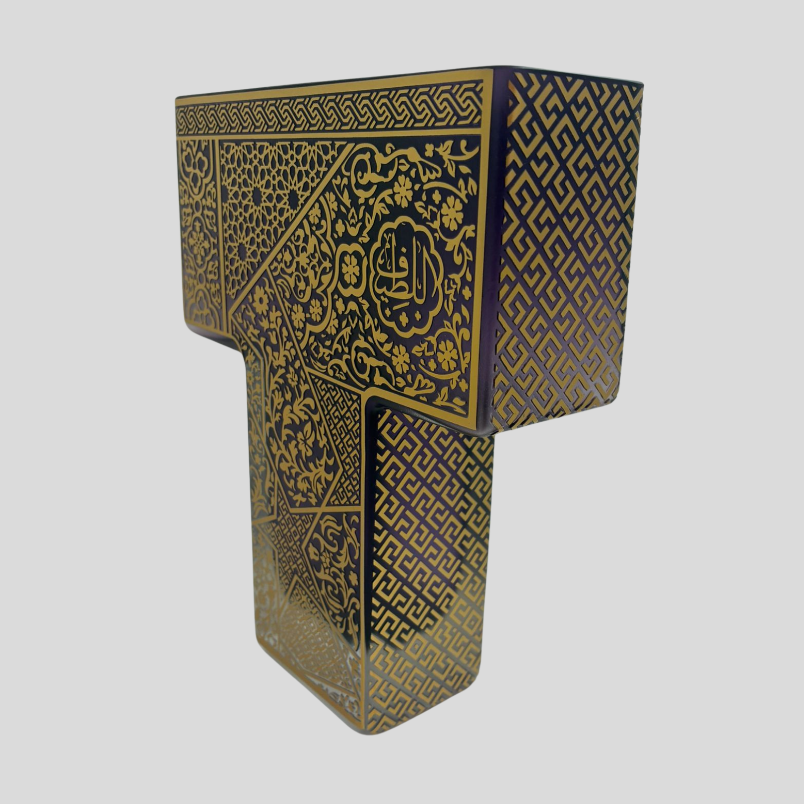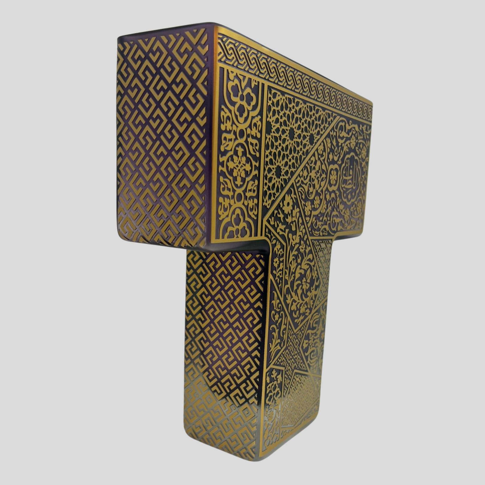 Eserin yüzeyinde yer alan geometrik ve bitkisel desenler, klasik İslam sanatının ince işçilik geleneğinden ilham alarak cam üzerine uygulanmıştır. Altın tonlarında işlenen bu motifler; sanat, anlam ve zarafetin uyumlu birlikteliğini yansıtır.