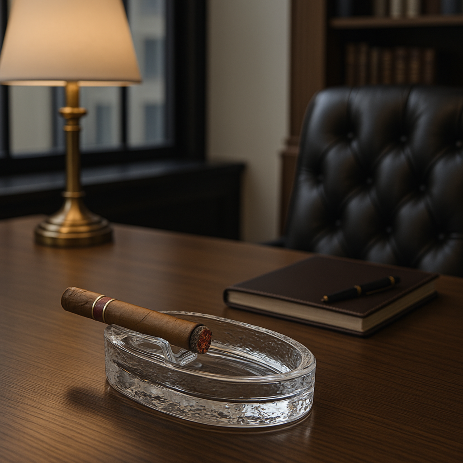Zarif çizgileri ve ağır yapısıyla öne çıkan bu el yapımı cam puro küllüğü, üst düzey ofislerin ve özel puro odalarının vazgeçilmez tamamlayıcılarından biri.
