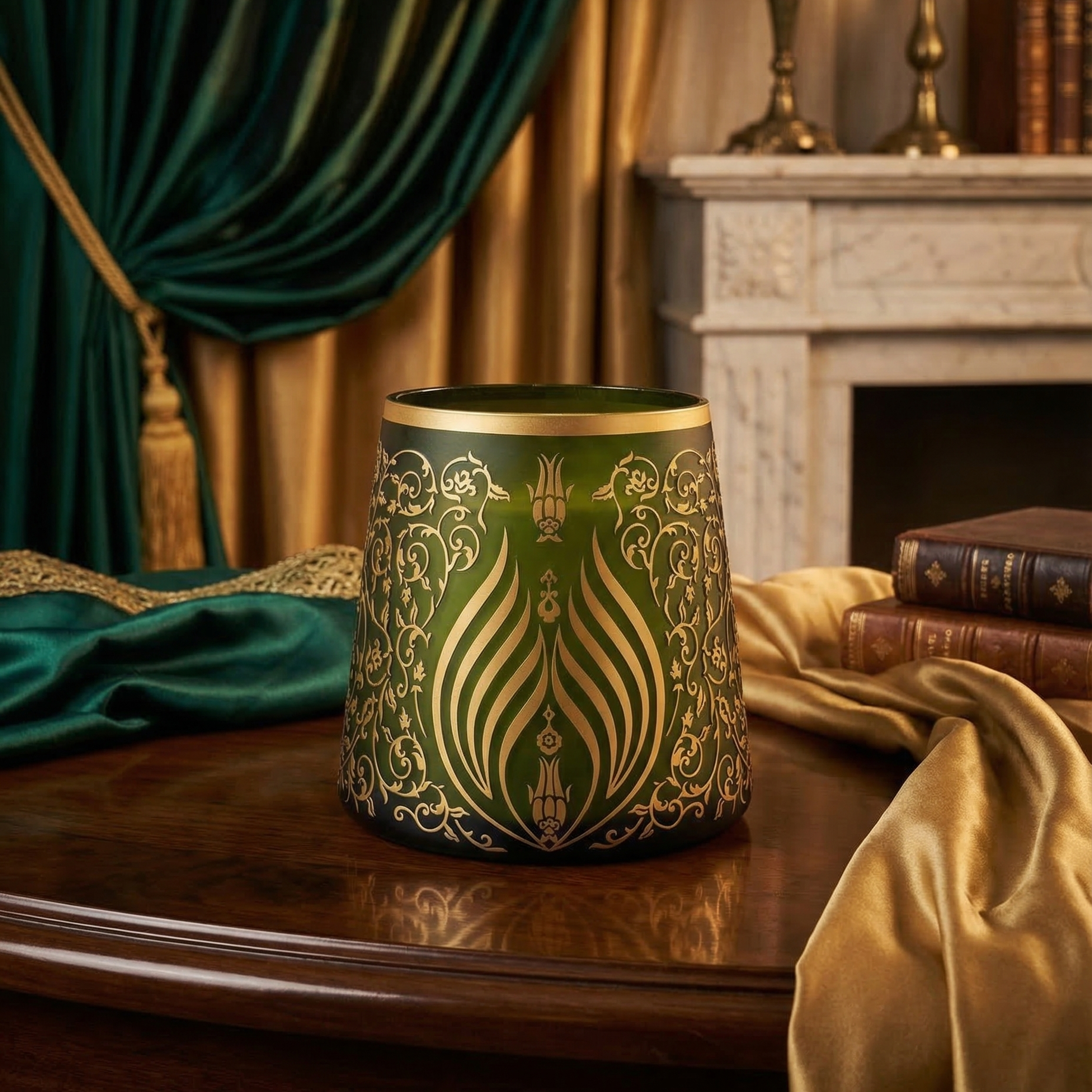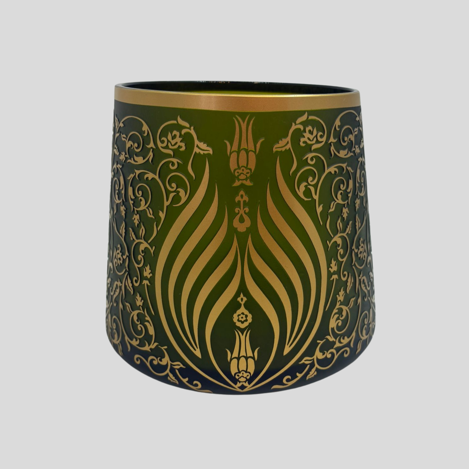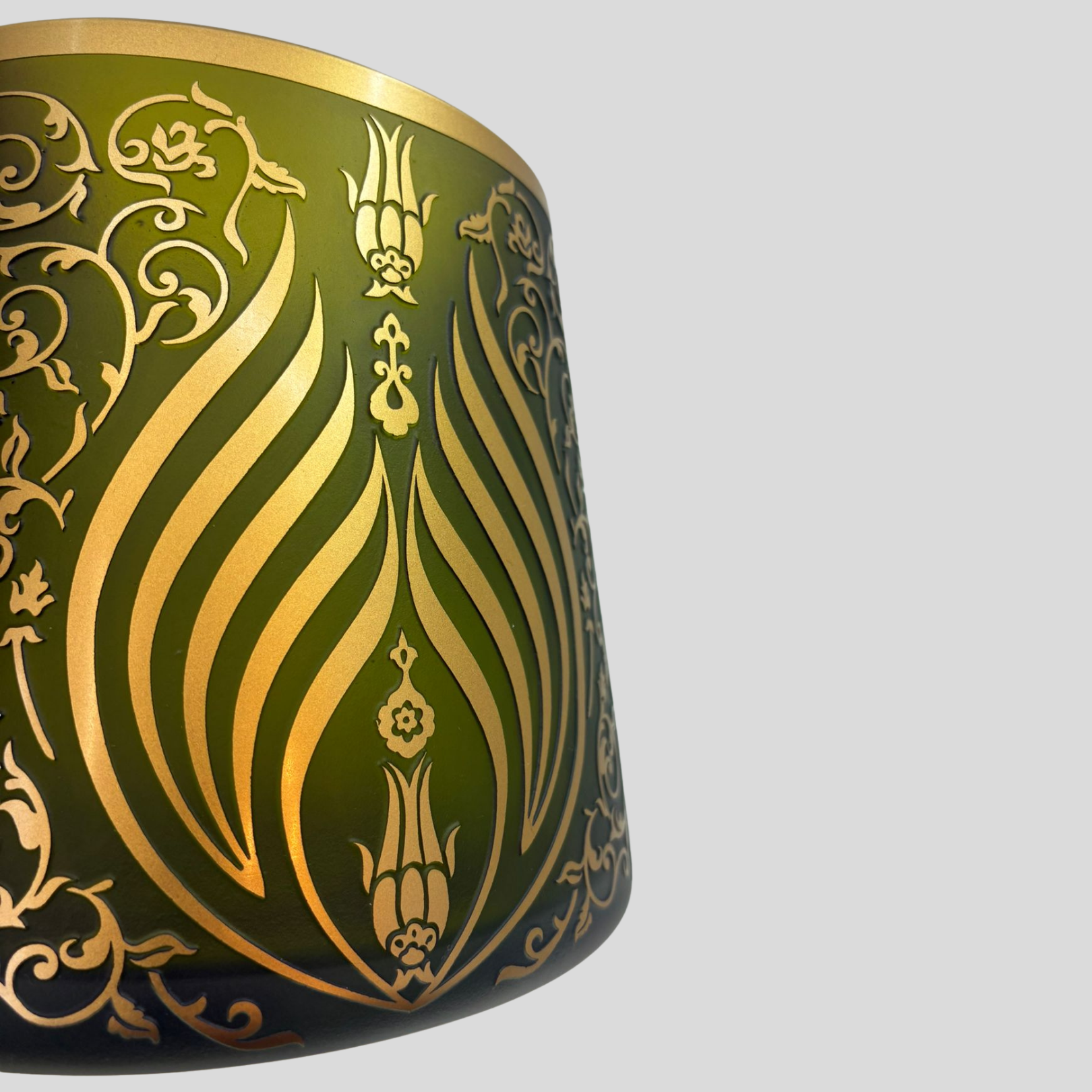 Yeşil cam yüzey ve altın dekorun uyumu sayesinde Elif Rumi Vazo; yaşam alanlarında, ofislerde veya özel koleksiyonlarda geleneksel sanatın modern bir yorumunu yansıtan dikkat çekici bir dekoratif obje olarak öne çıkar.