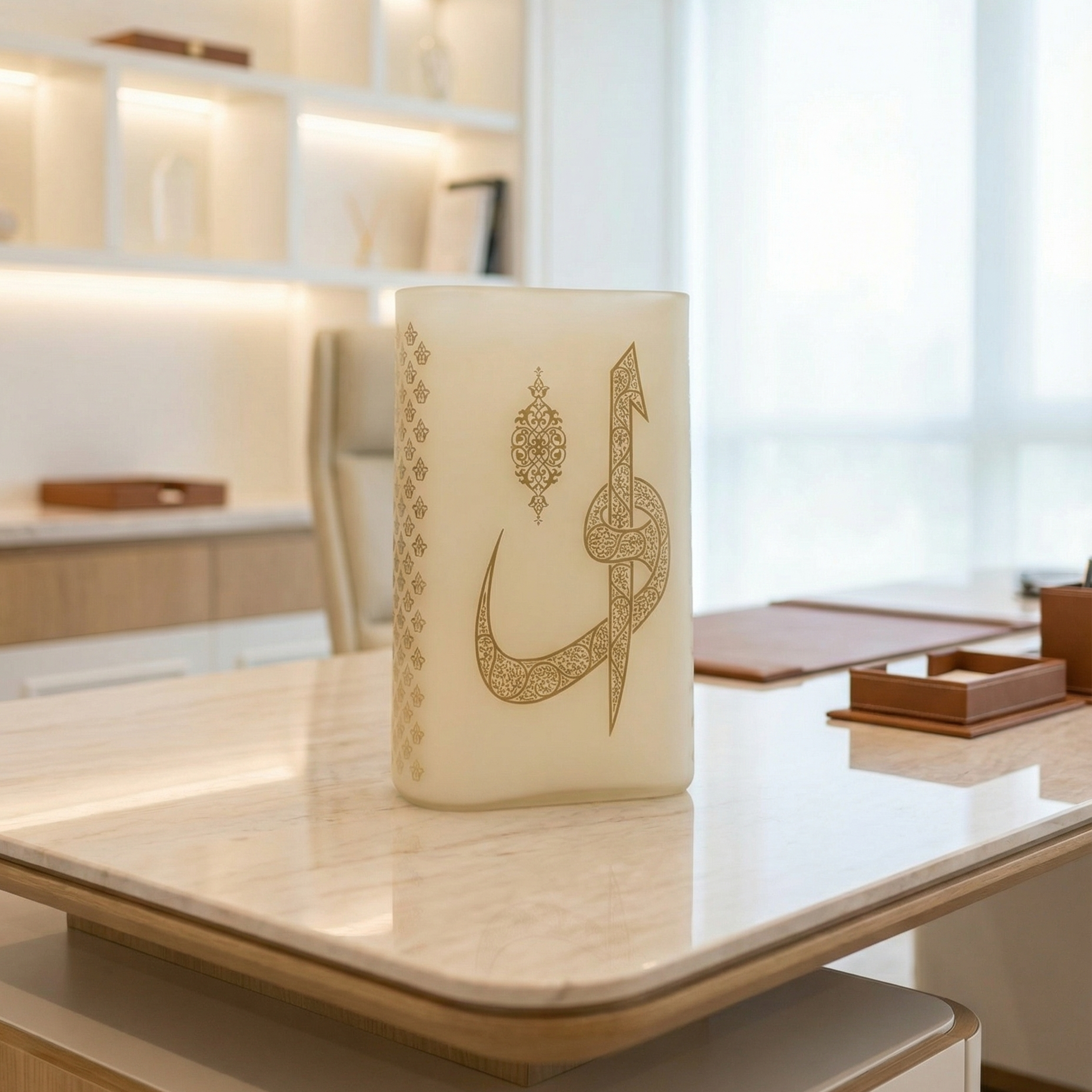 Koyu ahşap bir konsol üzerinde sıcak ışıkla kullanıldığında hat kompozisyonu daha belirgin görünür; açık renk raf düzeninde ise eserin formu daha sakin ve “galeri” hissi veren bir etki bırakır. Ofiste masaüstü ya da kitaplık önünde, anlamı olan bir imza obje gibi konumlanır.