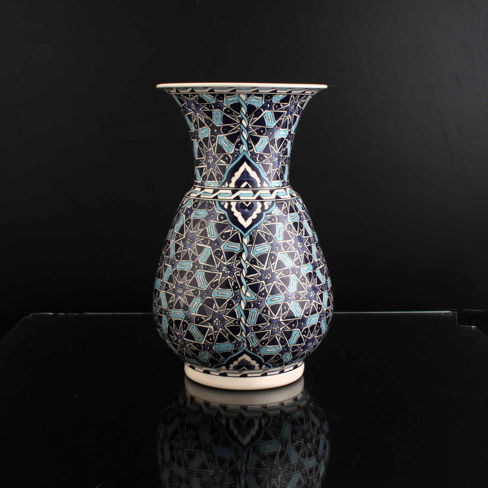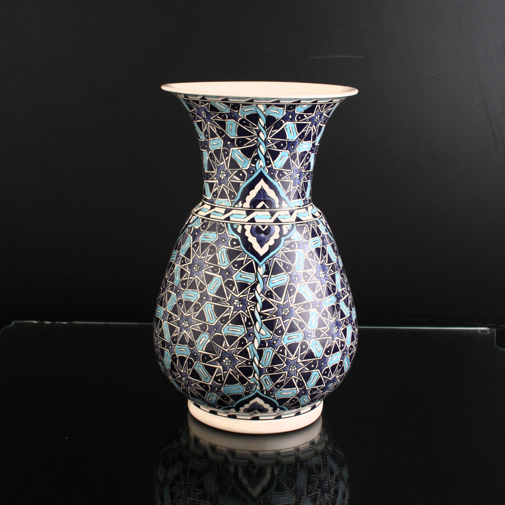 Selçuklu Sultan Mavisi, adını aldığı o güçlü mavi tonla ilk bakışta kendini belli eder. Bu ton yalnızca renk değil; Selçuklu estetiğinin “denge, kudret ve asalet” duygusunu taşıyan bir imzadır. El dekoruyla işlenen geometrik ve floral yorumlar, formu çevreleyen sakin bir ritim kurar ve eseri dekoratif bir objenin ötesine geçirir: kültürel anlamı güçlü, koleksiyonluk bir parça hâline getirir.