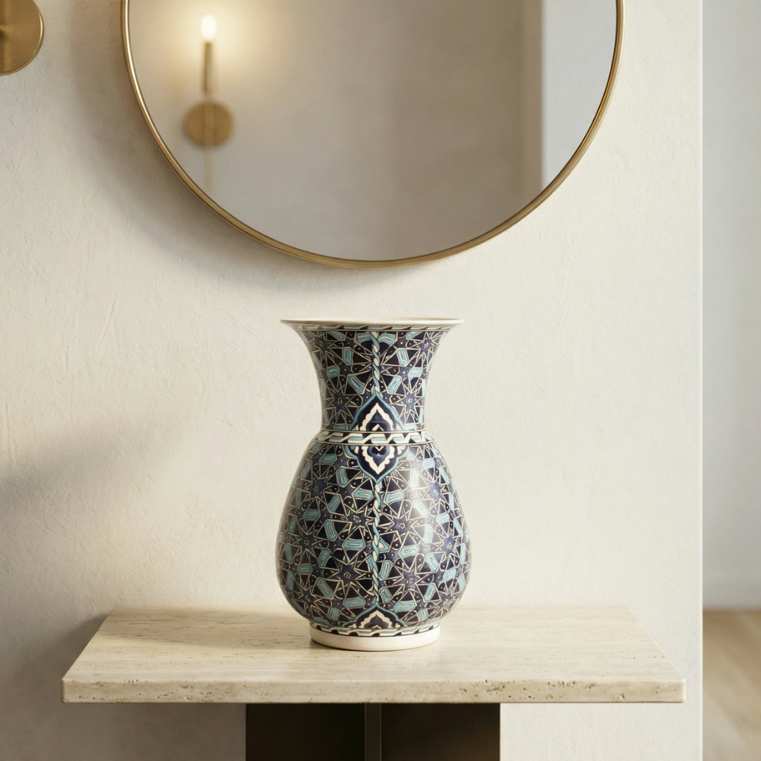 Açık renk duvar önünde mavi ton daha net ve “galeri” hissi verir. Koyu ahşap konsol üzerinde ise daha ağır ve prestijli görünür. Sade bir düzen içinde tek parça kullanıldığında en iyi etkiyi verir; alanı kalabalıklaştırmadan “seçkin parça” etkisi kurar.