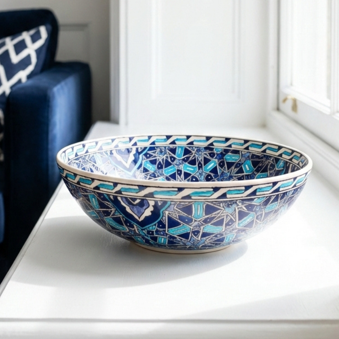 Açık taş/mermer yüzeylerde sultan mavisi daha “ferah” görünür; koyu ceviz ve antrasitte daha “tok” ve dramatik bir kontrast verir. Orta sehpa üzerinde tek başına merkez parça olur; konsolda ise yanına tek bir kitap/tek bir obje ile bile kompozisyonu tamamlar. Vitrinde, ışık aldıkça desenin ritmi daha belirginleşir.
