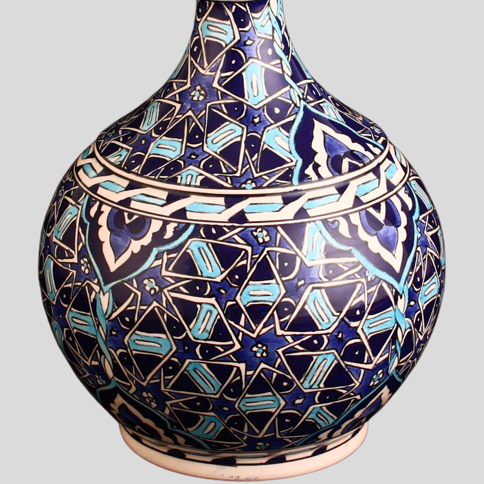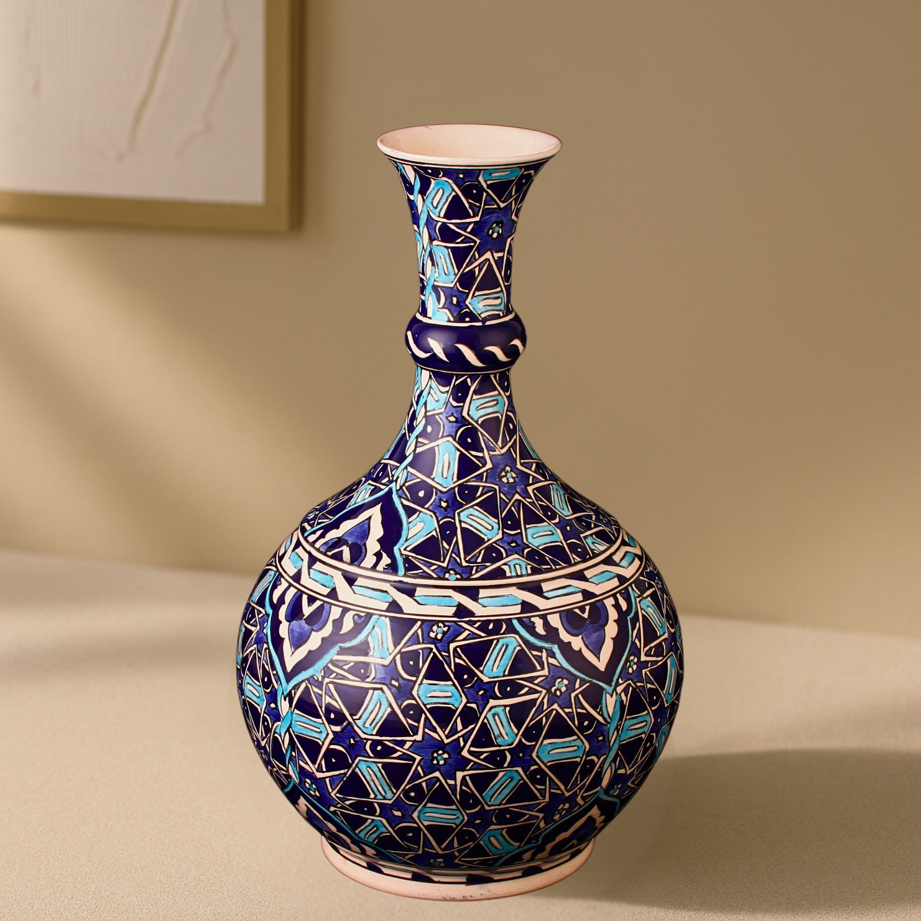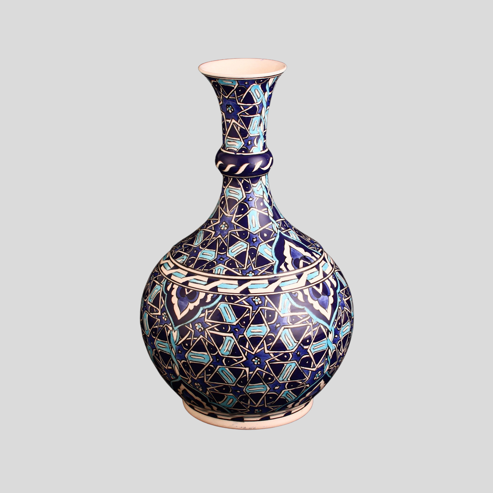 Sultan Mavisi Damla VazoSelçuklu Asaletini Yansıtan Mavi Tonların El Yapımı Yorumu Sultan Mavisi Damla Vazo , adını aldığı güçlü ve asil mavi tonu ile Selçuklu mimarisinin ve estetik anlayışının izlerini taşıyan özel bir çini eseridir. Sultan Mavisi Damla Vazo Bu etkileyici mavi yalnızca görsel bir vurgu değil aynı zamanda gücün, asaletin ve kudretin simgesidir. Selçuklu döneminde sıkça kullanılan geometrik desenlerin ve floral motiflerin modern yorumları bu eserde ustalıkla işlenmiştir.