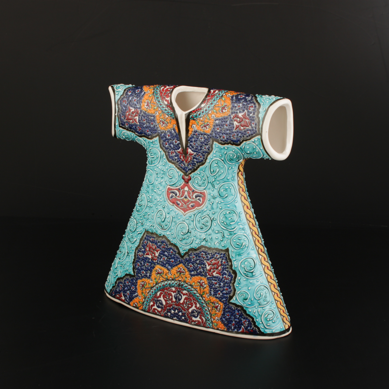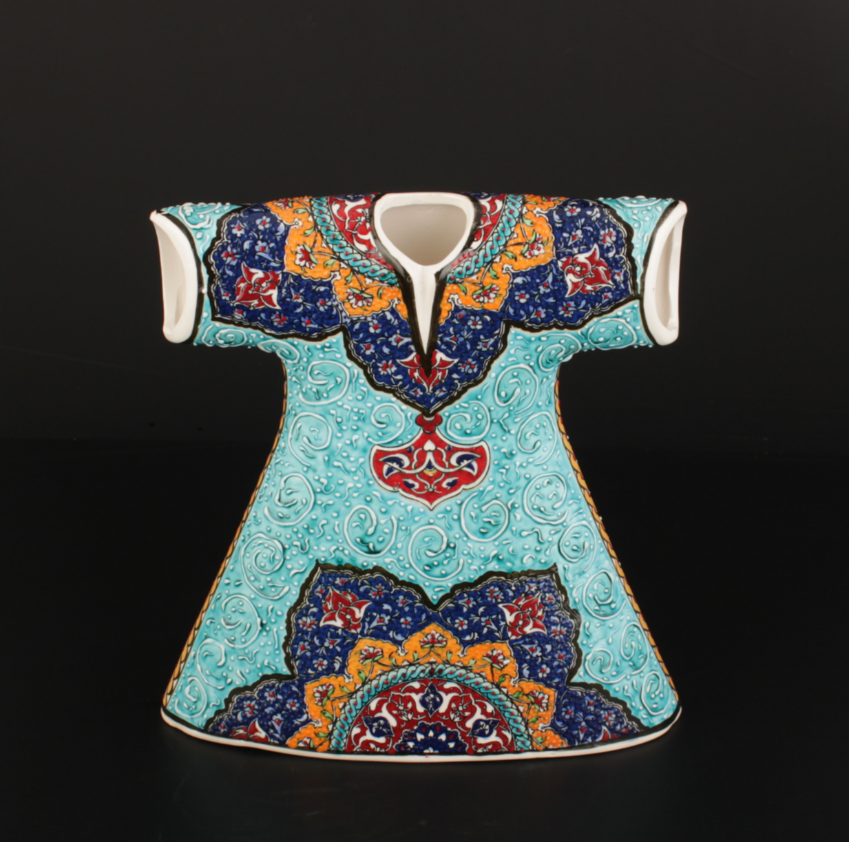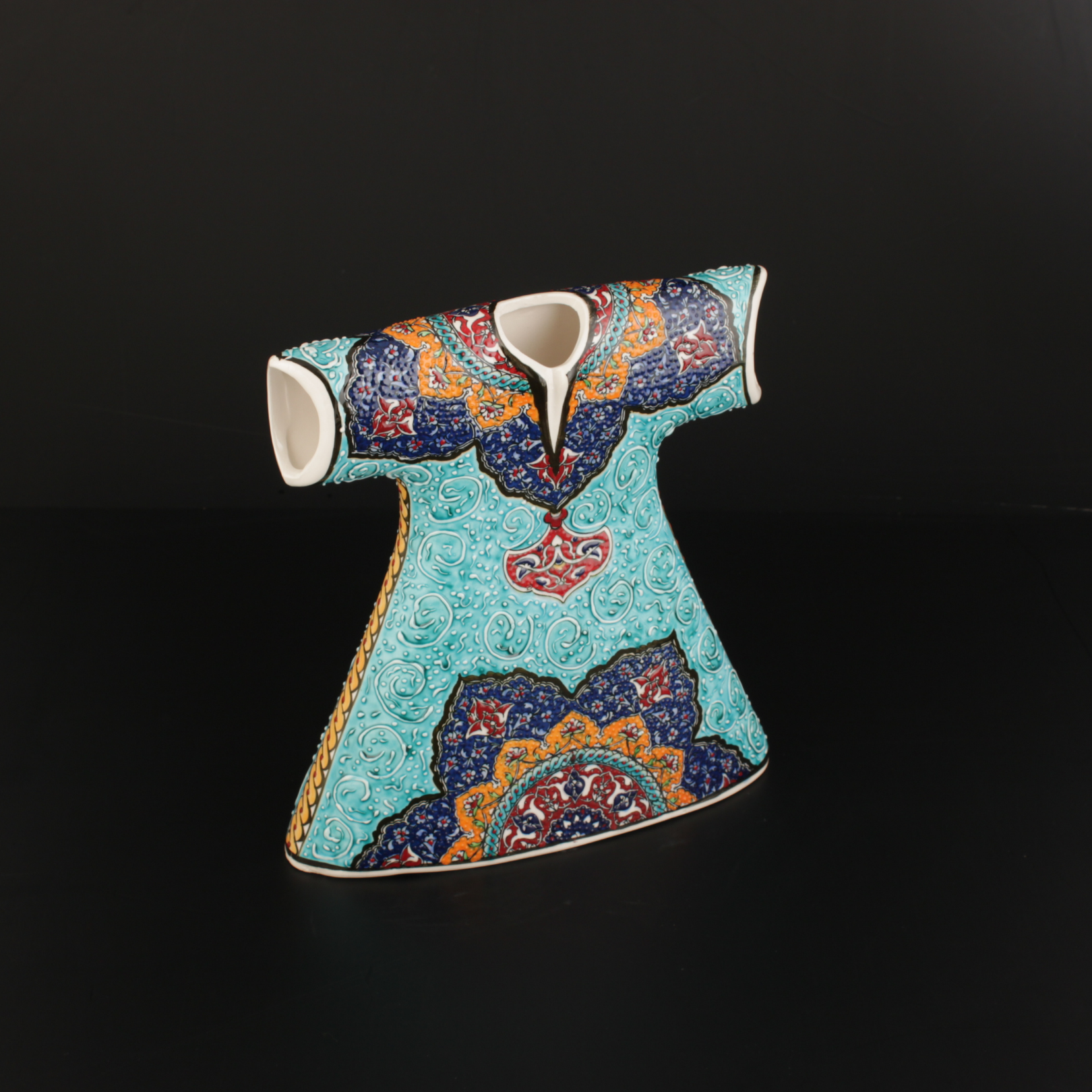 Firuze Bulut Kaftan, firuze sırın dinginliğini “bulut” motifinin akıcı kıvrımlarıyla buluşturan el yapımı bir çini objedir. Kaftanın koruyucu formu, semaya bakan bu yumuşak kıvrımlarla hafifler; mekâna hem klasik bir asalet hem de ferah bir aydınlık taşır. Her parça ustasının elinde tek tek şekillenir ve elde dekore edilir.