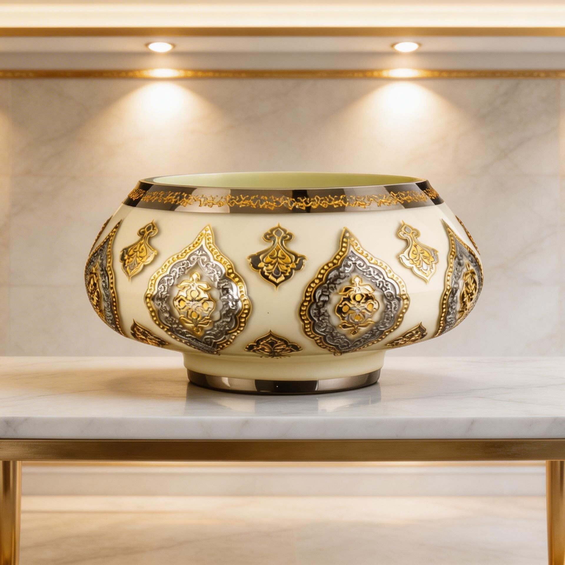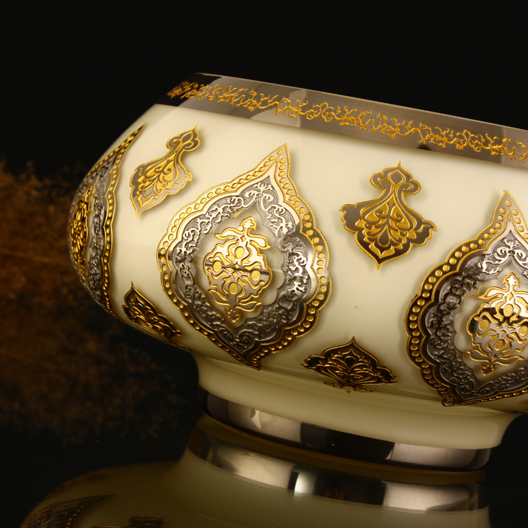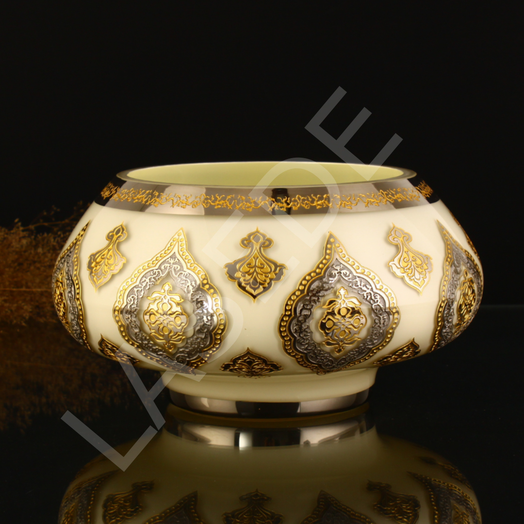 Geniş ağız yapısı ve dengeli formu sayesinde salonlarda, konsol üstlerinde, vitrinlerde, makam odalarında ve özel sunum alanlarında estetik bir odak oluşturur. Platin parlaklığının serin ve seçkin etkisi, altın detayların sıcak vurgusuyla birleşerek Topkapı esintisini güçlü bir biçimde hissettirir. Tek başına sergilendiğinde imza parça etkisi oluştururken, seçkin dekorasyon kurgularında da zarif bir tamamlayıcı olarak öne çıkar. El yapımı bir Lasede tasarımı.