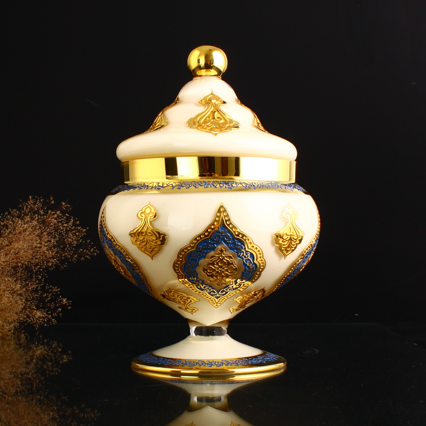 Salonlarda, vitrinlerde, konsol üstlerinde, makam odalarında ve özel sunum alanlarında dikkat çekici bir odak oluşturan bu özel tasarım; klasik estetik anlayışı sevenler için seçkin bir tamamlayıcıdır. Altın yaldızın güçlü ışıltısı ile lacivert desenlerin derinliği bir araya gelerek Topkapı esintisini yaşam alanlarına taşır. Hem ikram sunumlarında hem de dekoratif kullanımlarda prestijli bir duruş sergileyen bu eser, özel hediye seçimleri için de güçlü bir alternatiftir. El yapımı bir Lasede tasarımı.