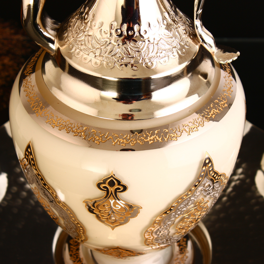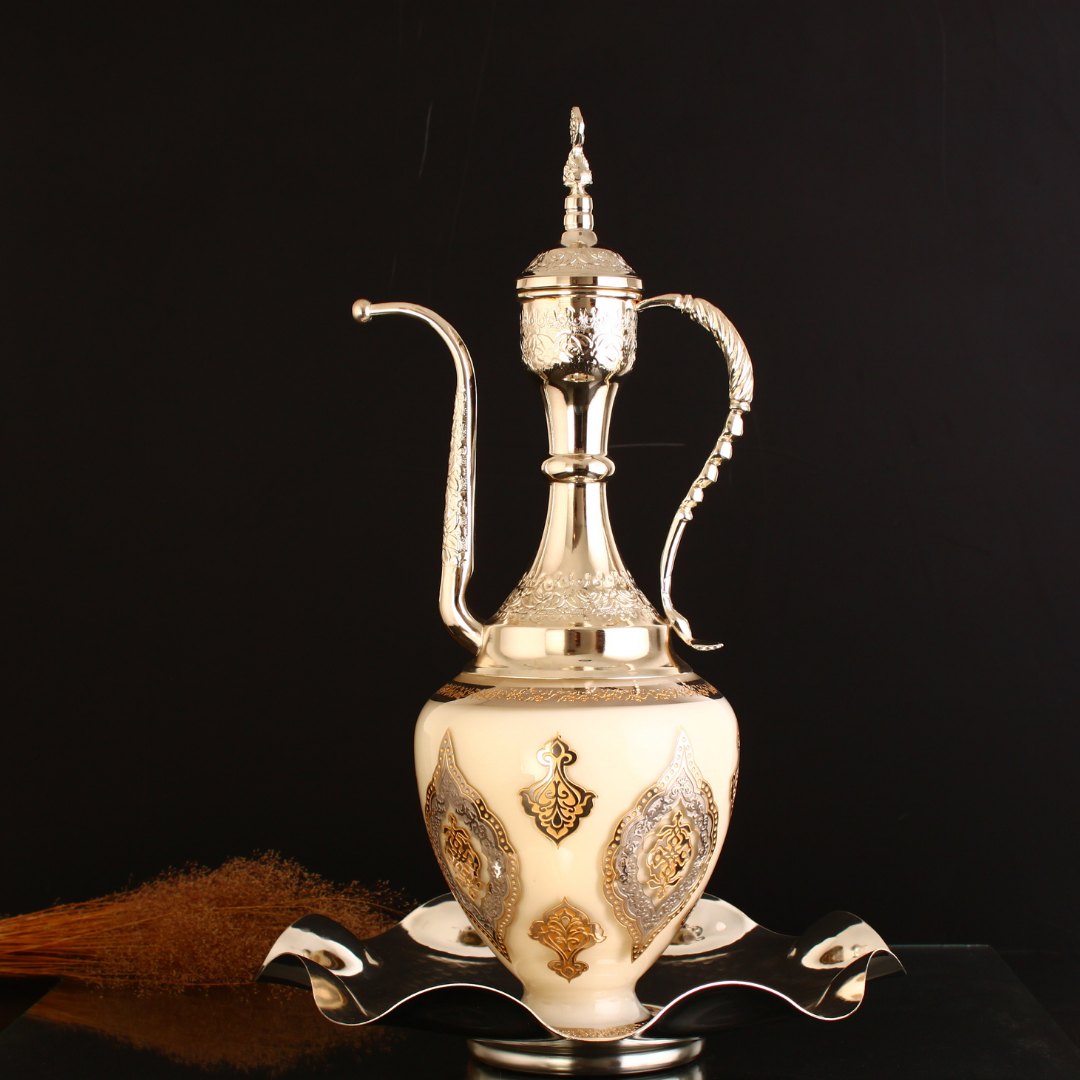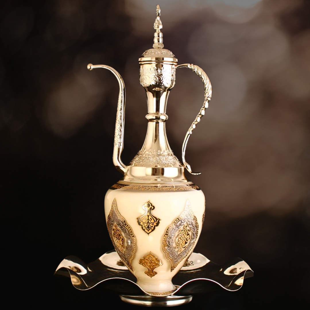 Gevher Topkapı İbrik Platin, Topkapı Sarayı’nın zarafetini uzun ve etkileyici bir siluet üzerinde yeniden yorumlayan seçkin bir tasarımdır. İnce boynu, dengeli gövdesi ve ihtişam duygusu taşıyan formu sayesinde bulunduğu mekânda yalnızca dekoratif bir obje olarak değil, kültürel hafızası olan güçlü bir sanat eseri olarak öne çıkar. El yapımı cam yüzey üzerinde yükselen platin etkili bezeme dili, geçmişin saray estetiğini bugünün yaşam alanlarına rafine bir yorumla taşır. Topkapı Sarayı’nın ipekli yer yaygıları koleksiyonundaki özel motiflerden ilham alan bu eser, tarihî zenginliği çağdaş bir dekorasyon diliyle buluşturur.