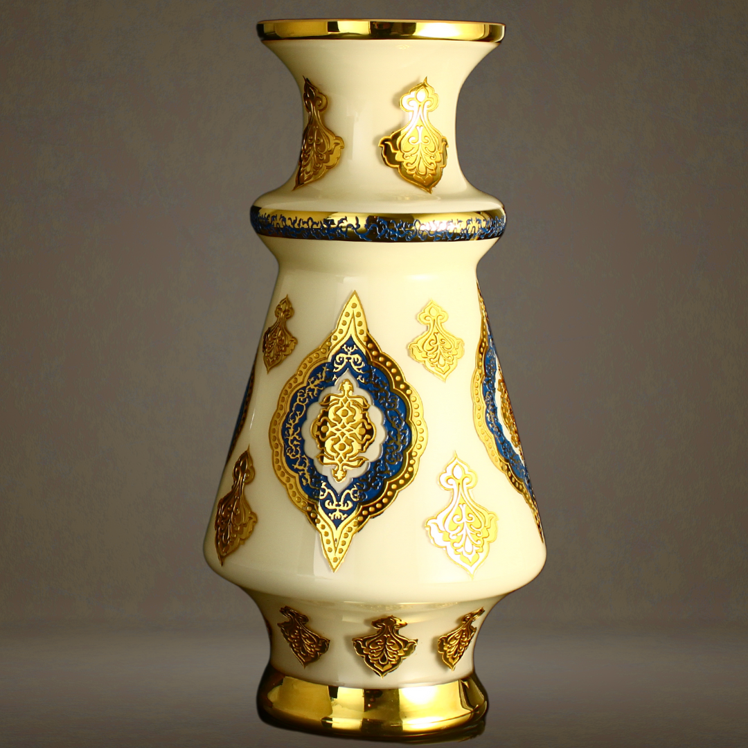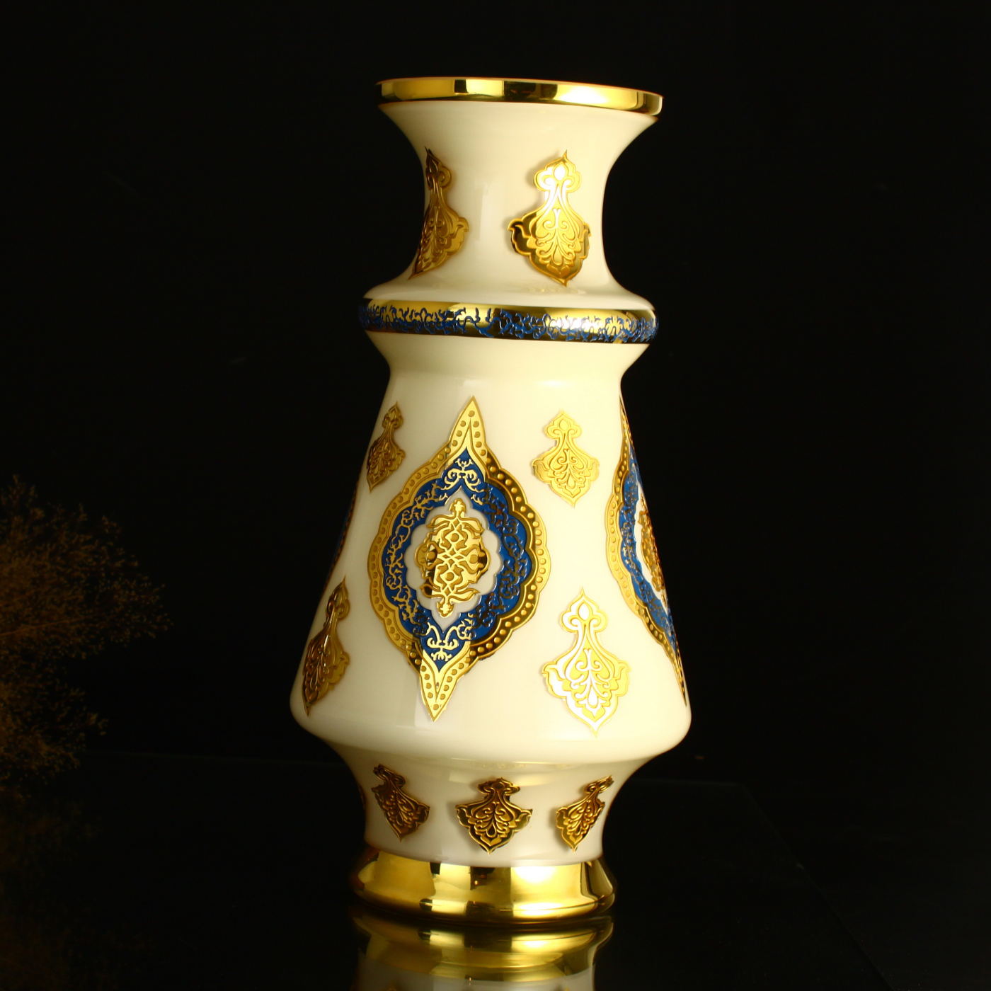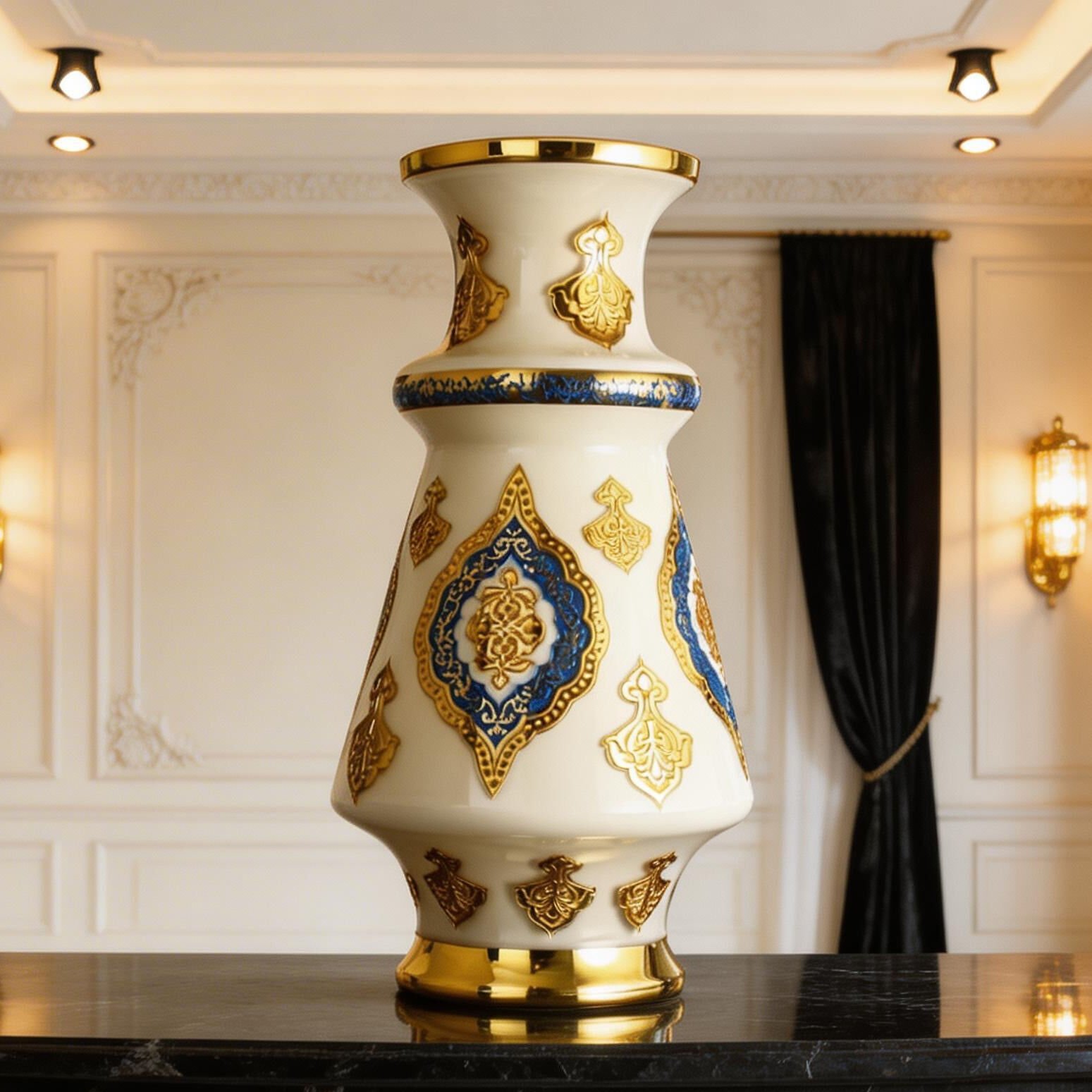 Topkapı Sarayı’nın ihtişamından ilham alan Gevher Topkapı Vazo Altın, klasik saray estetiğini günümüz dekorasyon anlayışıyla buluşturan gösterişli bir tasarımdır. Krem zemin üzerine uygulanan altın detaylar ve lacivert bezeme kuşakları, esere hem görkemli hem de dengeli bir karakter kazandırır. Formundaki zarif daralma ve genişleme, vazonun siluetine güçlü bir duruş kazandırırken üzerindeki motifler onu yalnızca dekoratif bir obje olmaktan çıkarıp kültürel bir anlatıya dönüştürür.