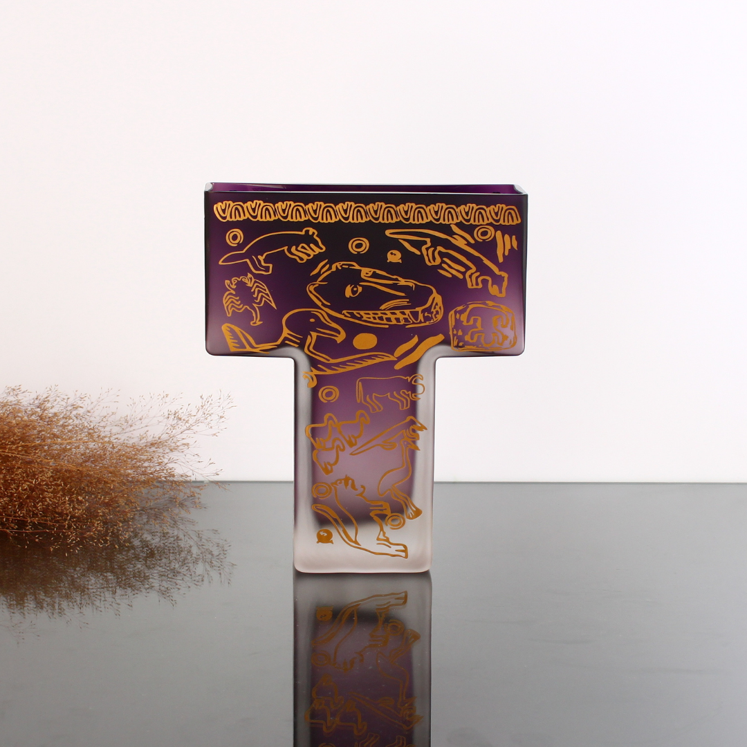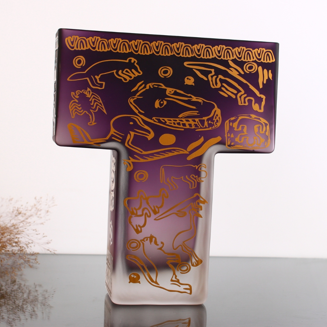 Göbekli Tepe’nin taş sütunlarından ilham alan, figürlerle bezenmiş el işçiliği cam vazo.
