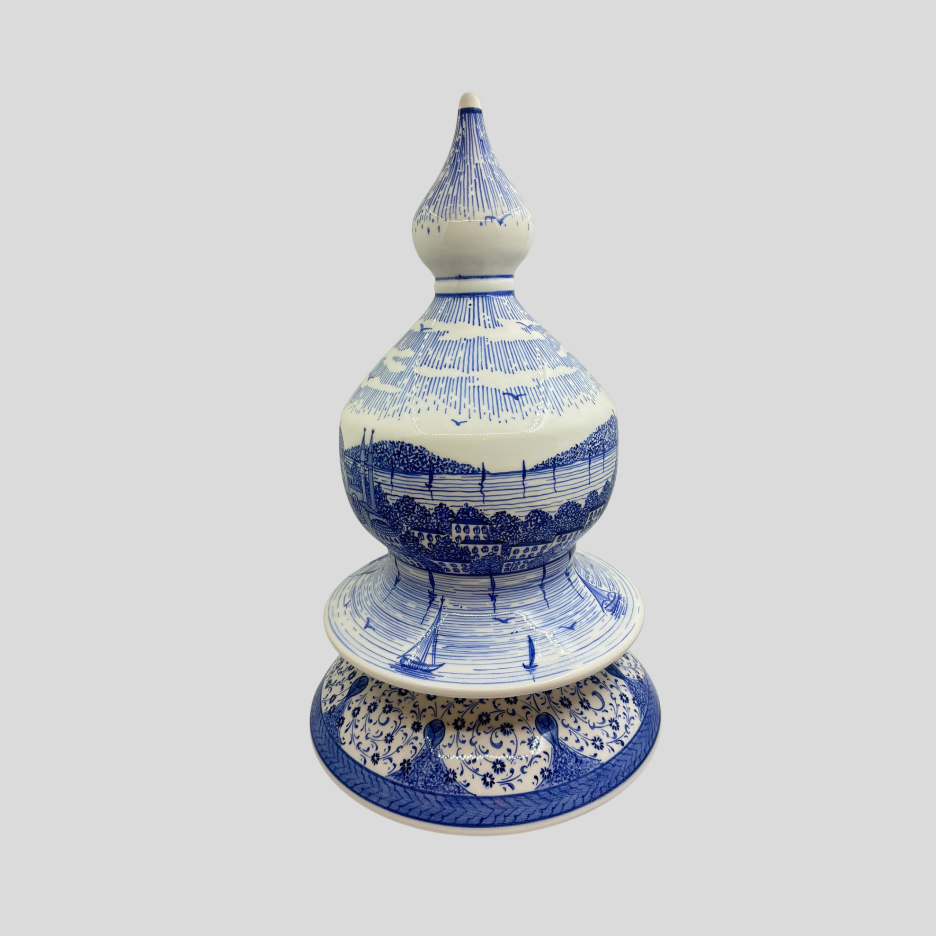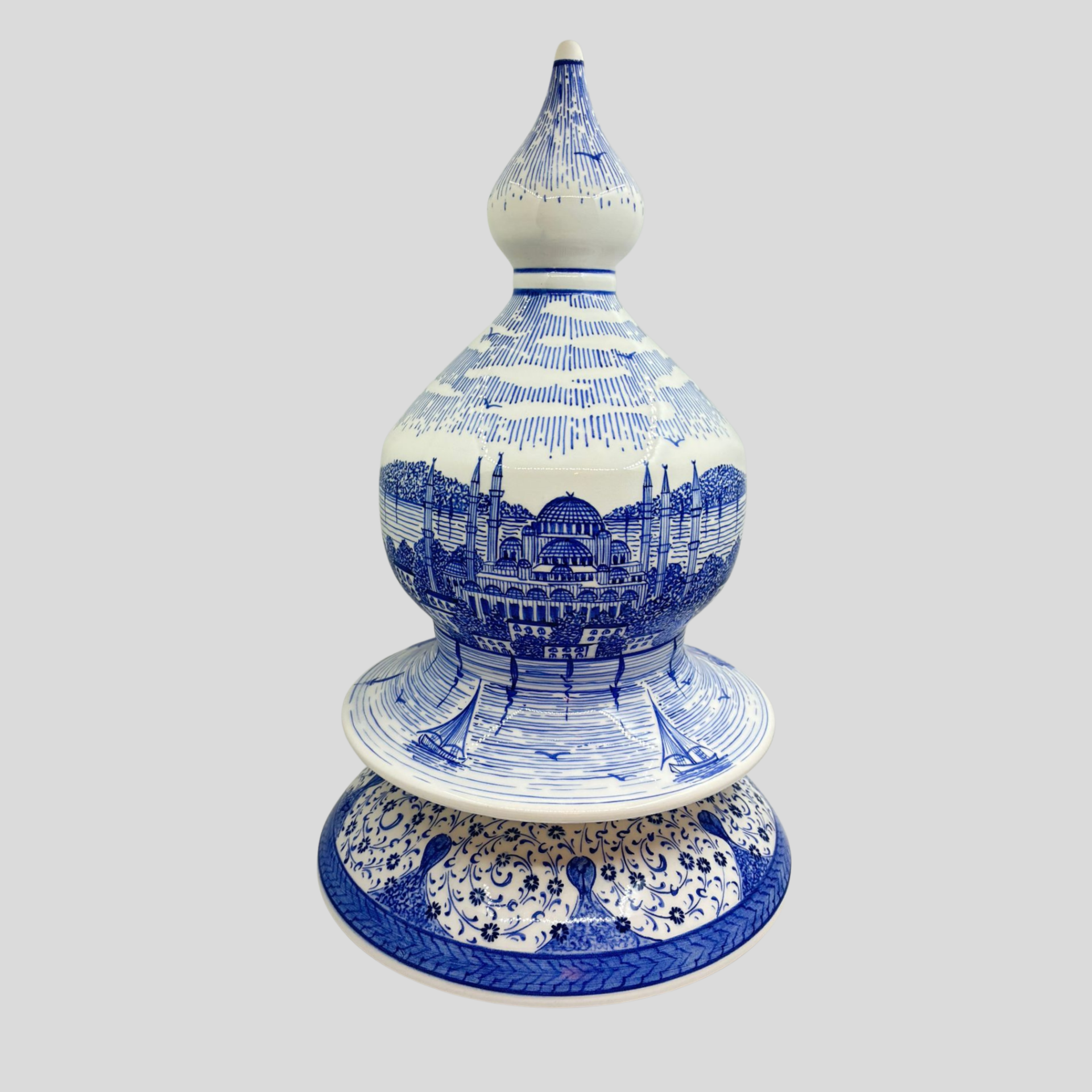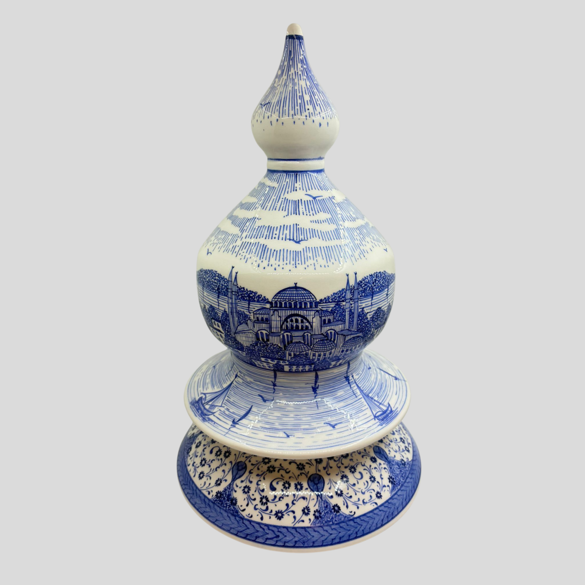 Haliç Kıyı İstanbul Vazo, şehrin tarihi dokusunu mavi beyaz çini estetiğiyle bir araya getiren özel bir tasarımdır. Formundaki klasik denge, yüzeyine işlenen İstanbul manzarası ve kapakla tamamlanan bütüncül duruş sayesinde bulunduğu alanda seçkin bir etki oluşturur. Haliç kıyılarının hafızasını taşıyan bu yorum, yalnızca dekoratif bir obje olmanın ötesine geçerek kültürel aidiyet duygusu uyandıran güçlü bir parçaya dönüşür. Mavi beyaz desen dili, ürüne ferah ve zamansız bir karakter kazandırırken; detaylardaki şehir anlatımı eseri daha yakından incelendikçe derinleşen bir sanat objesi haline getirir. Ev dekorasyonunda, makam odalarında, vitrinlerde ve özel köşelerde dikkat çeken bir odak parça olarak öne çıkar. El yapımı bir Lasede tasarımı.