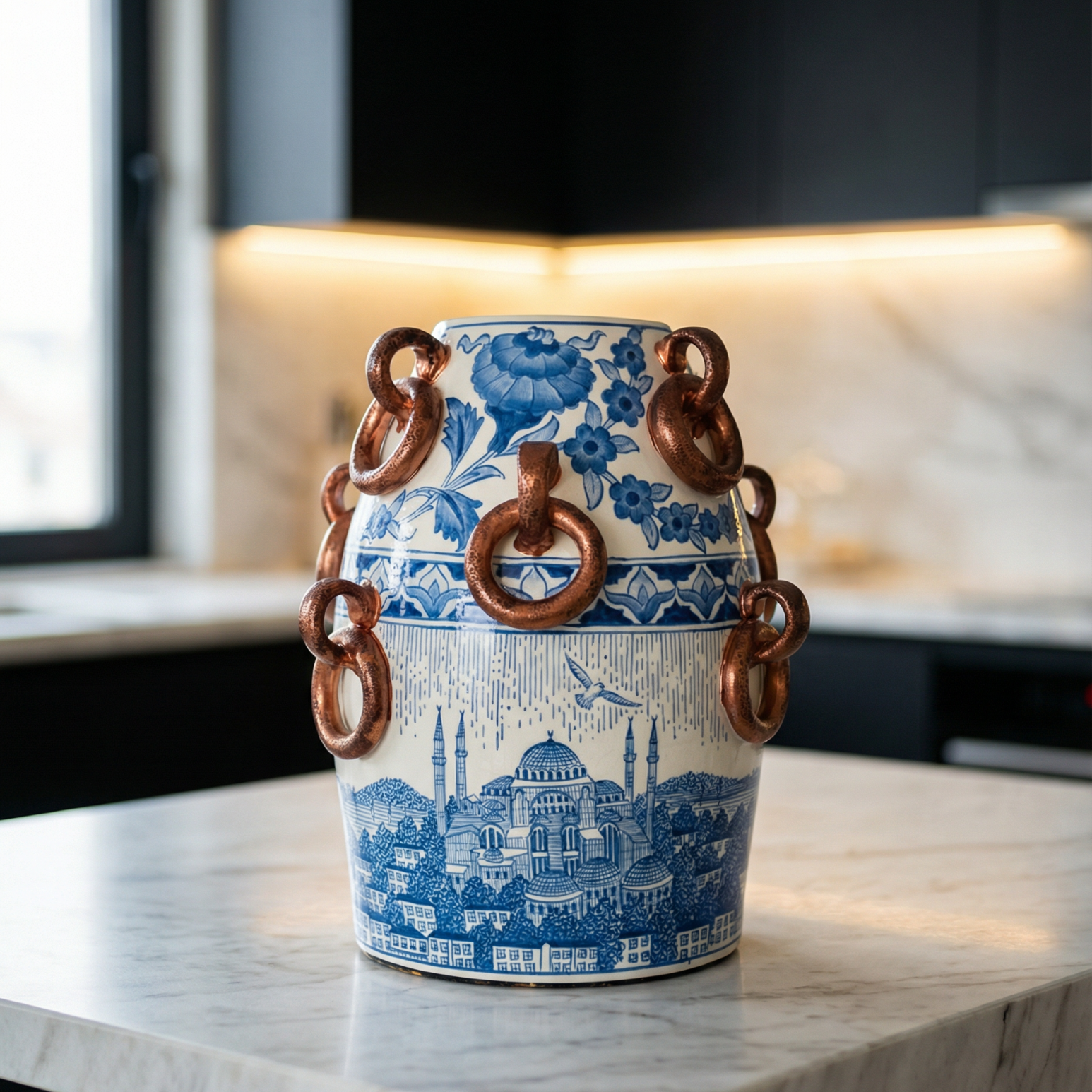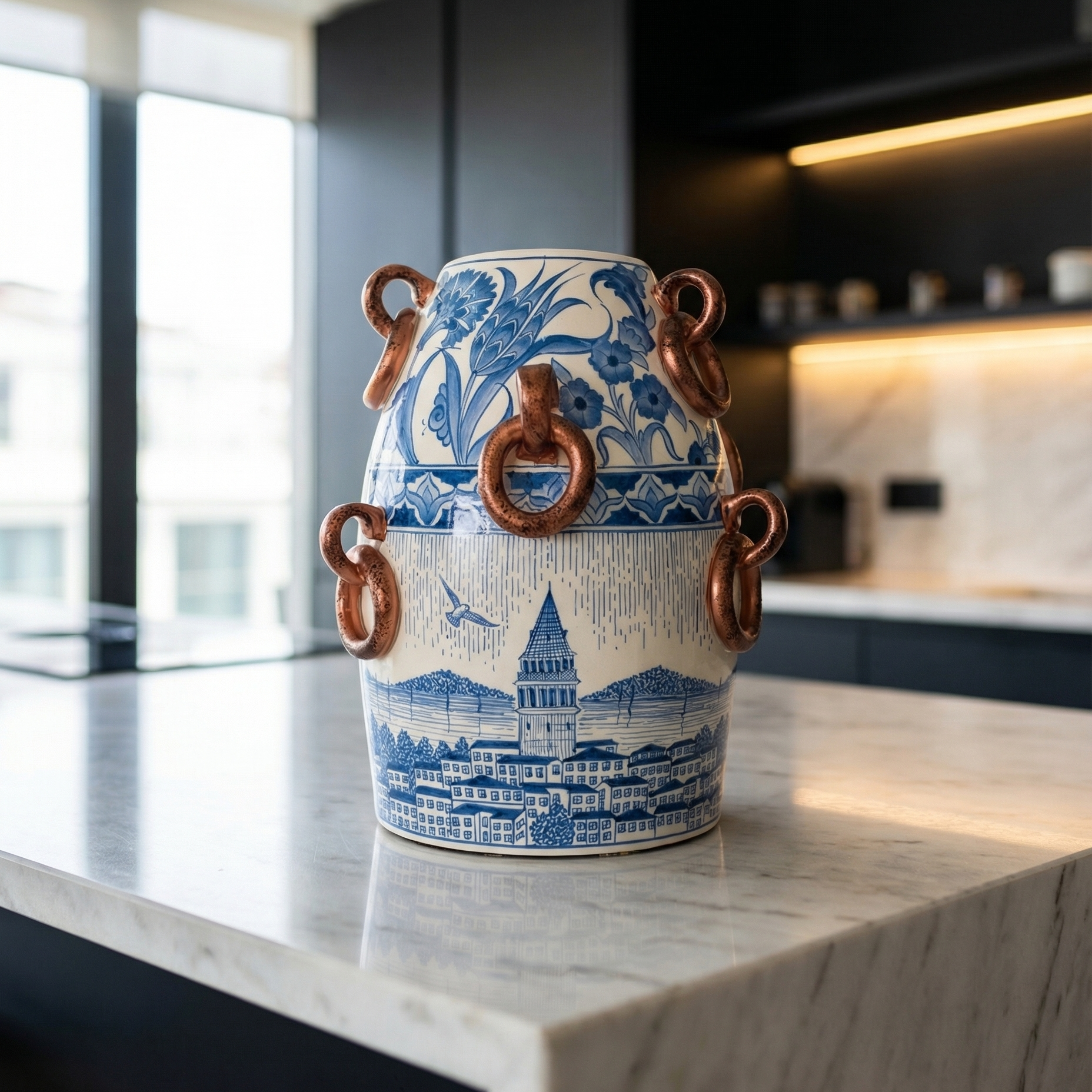 Halkalı İstanbul Seramik Obje; mavi-beyaz çini estetiğiyle işlenen İstanbul silüetini, formun çevresindeki halka detaylarıyla modern bir yorumda buluşturur. Seramik yüzeydeki desen katmanları, ürüne hem nostaljik hem de çok “koleksiyon” bir hava verir. 26 cm uzunluğu ve 20 cm eniyle mutfak tezgâhı, konsol, raf ve masa üstünde tek başına sergilendiğinde mekânı toparlayan, merak uyandıran bir odak objedir.