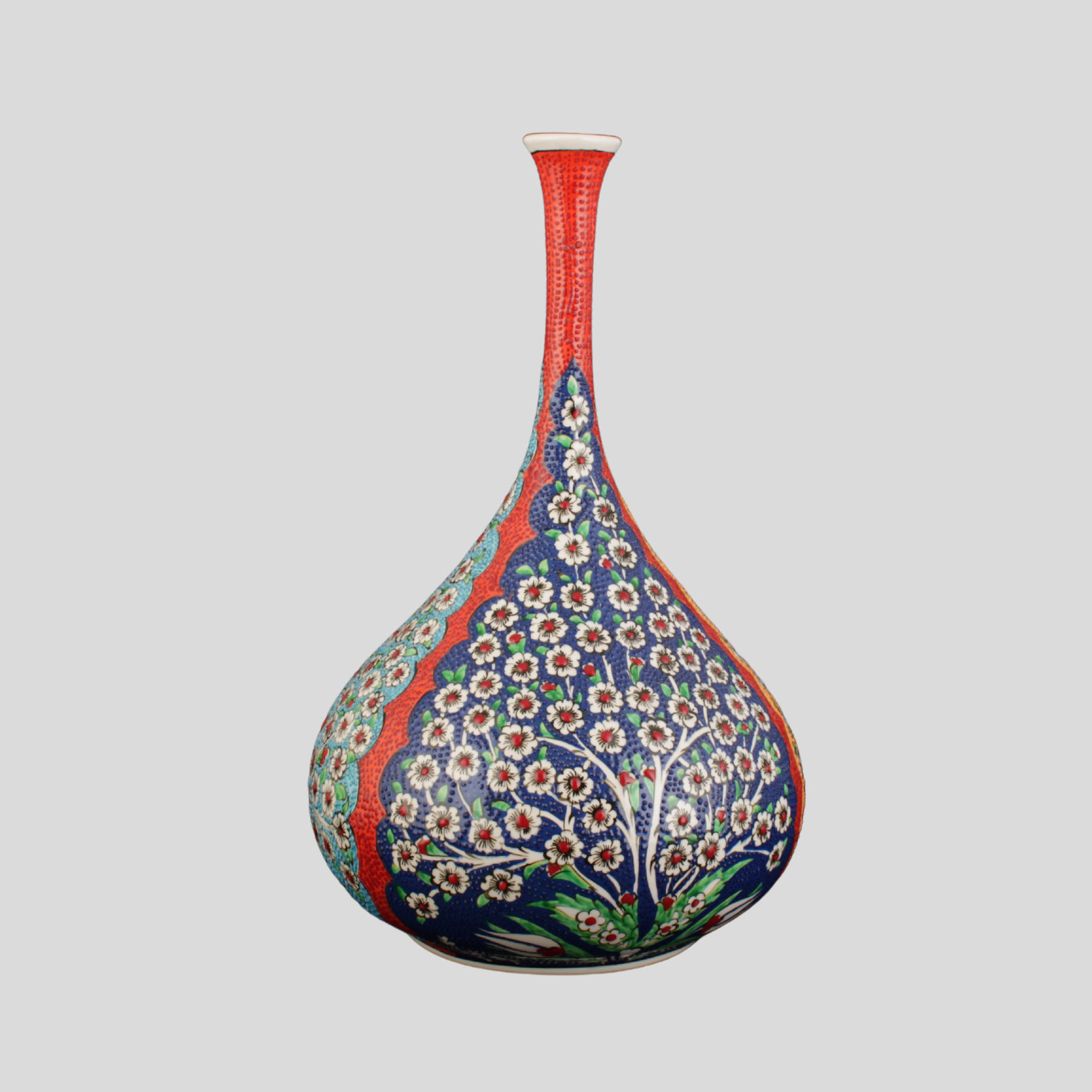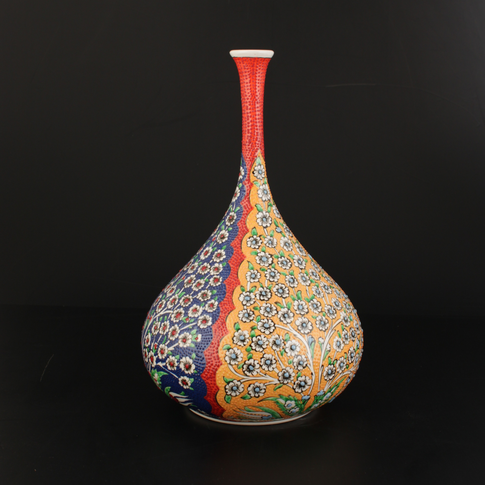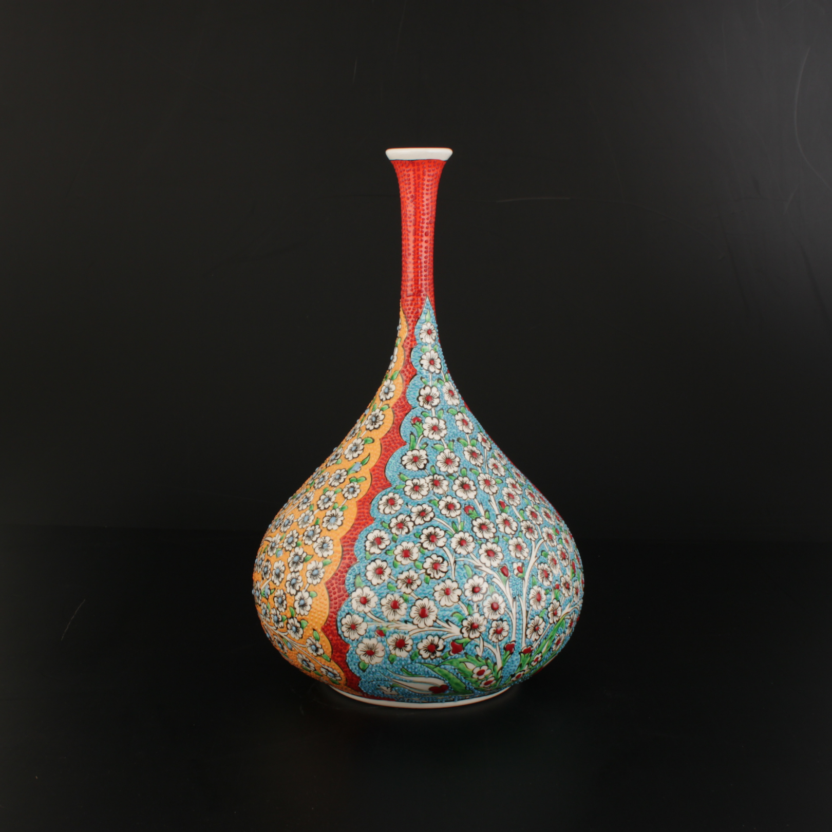 El yapımı çini vazo; Hayat Ağacı motifini çağdaş bir kompozisyonla sunan seçkin bir parça.