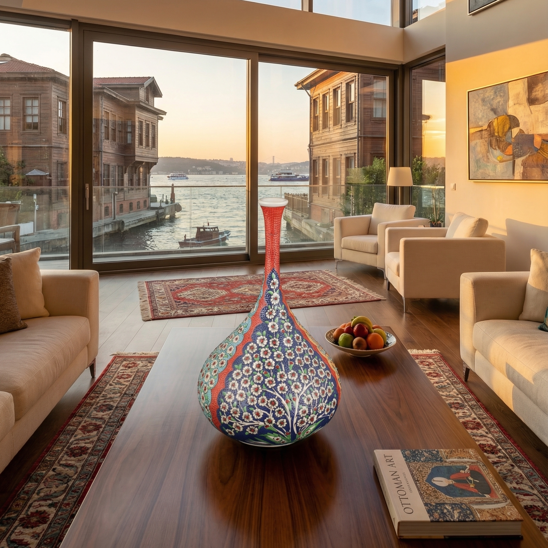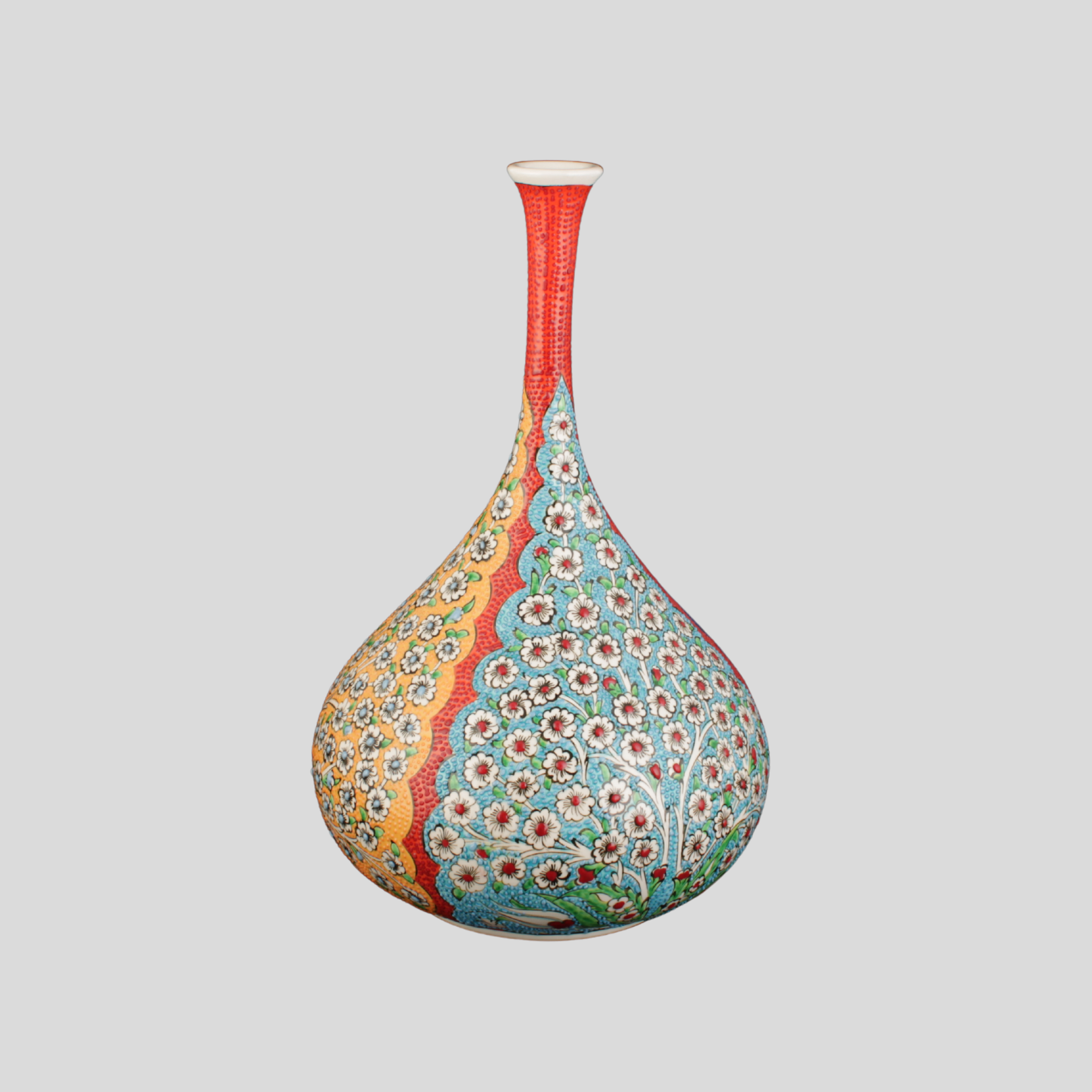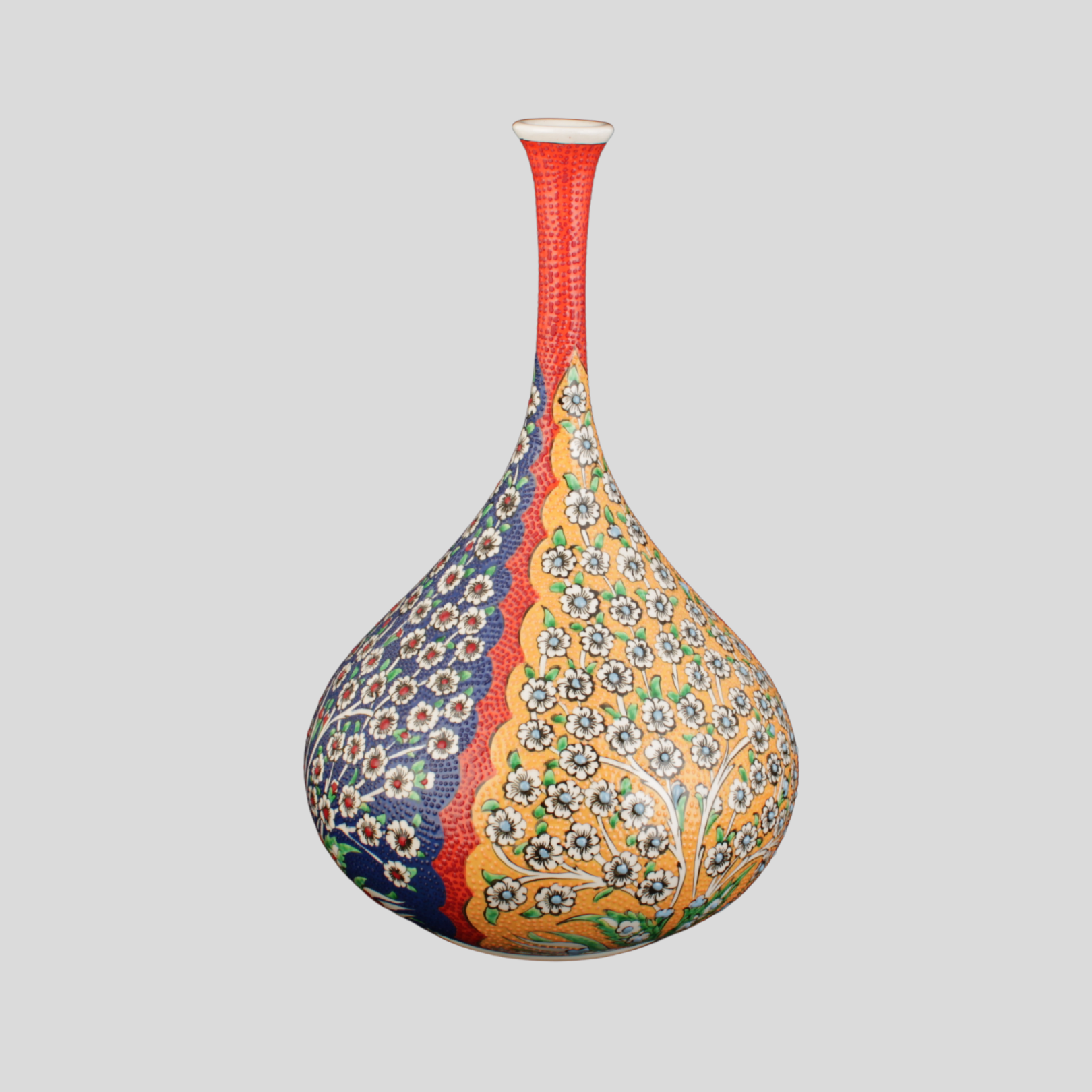 El yapımı çini vazo; Hayat Ağacı motifini çağdaş bir kompozisyonla sunan seçkin bir parça.