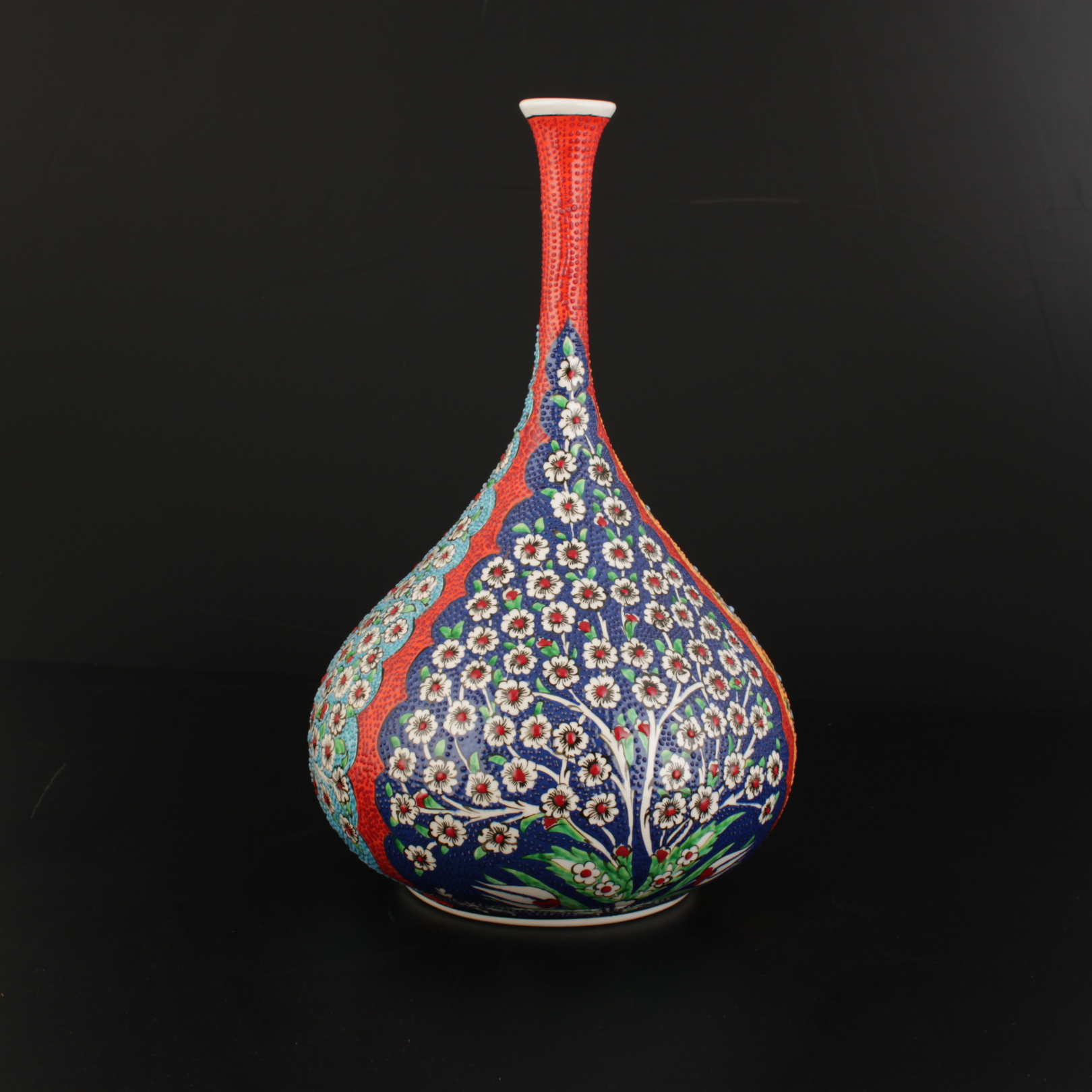 Hayat Ağacı, el yapımı çini işçiliğini kültürel bir sembolün gücüyle birleştiren seçkin bir vazodur. Köklerden yükselen dalların ritmi, formun dikey zarafetiyle buluşur; mekâna hem geleneksel bir ruh hem de çağdaş bir duruş kazandırır. Her parça ustasının elinde şekillendiği için benzersizdir ve prestijli bir hediye seçeneği sunar.