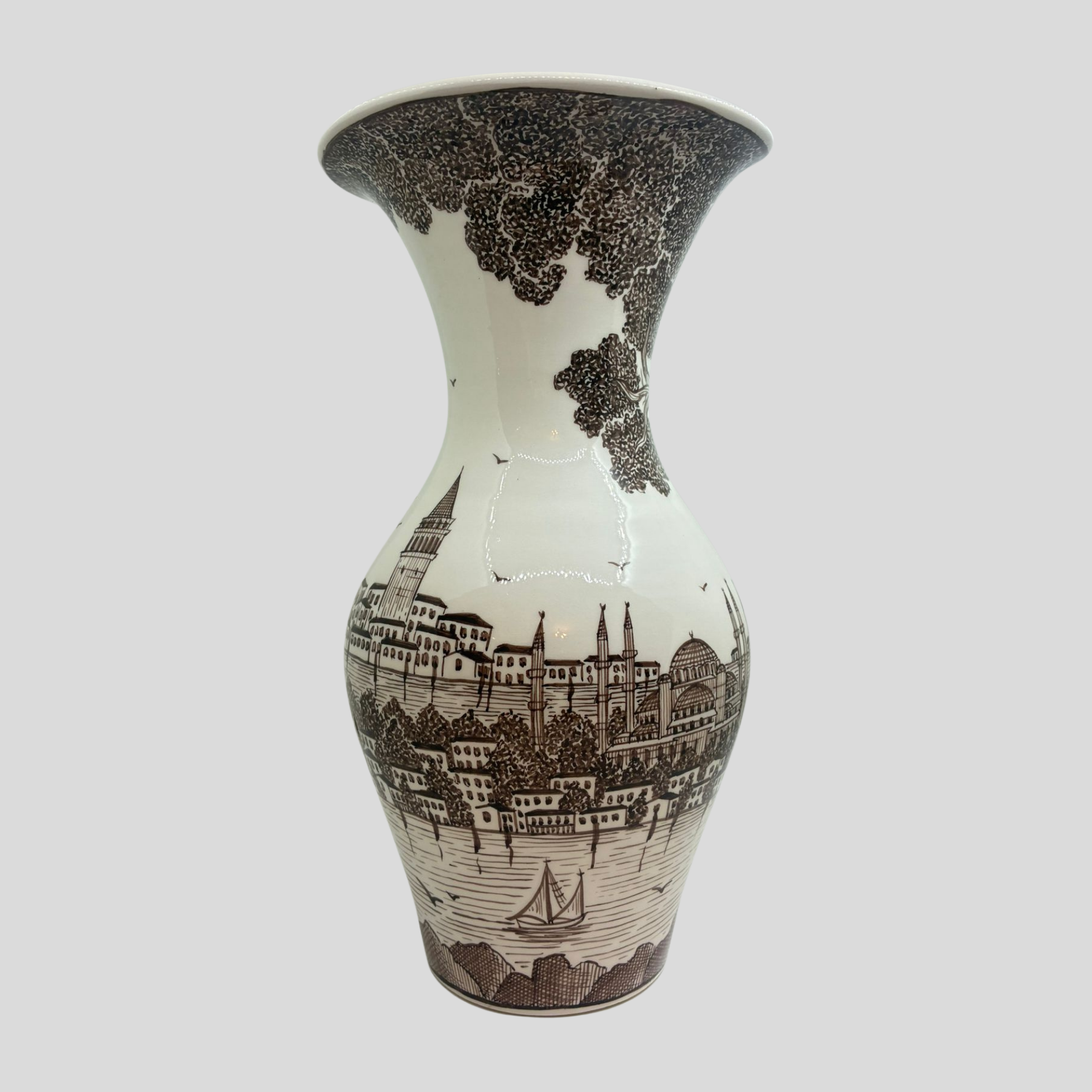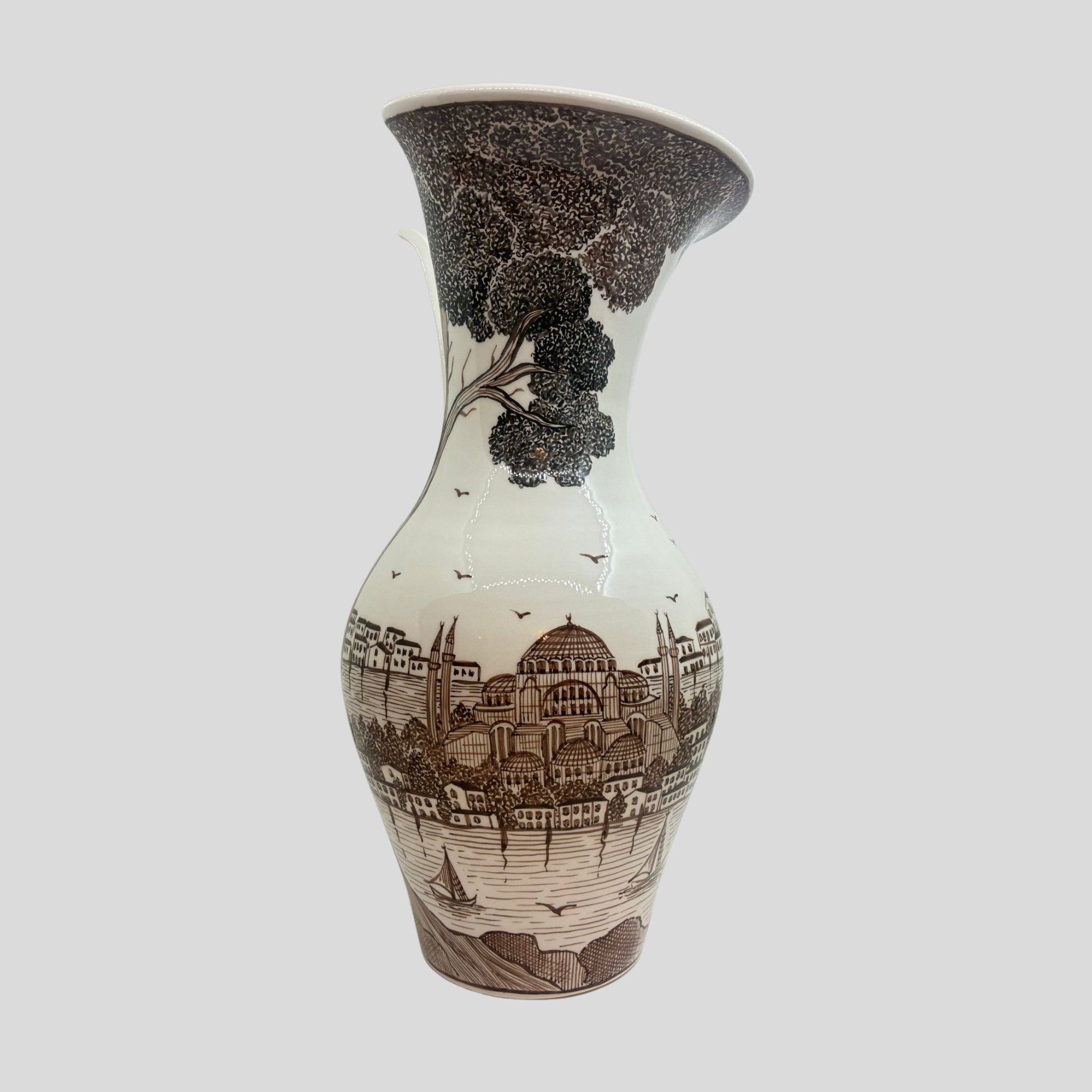 Hayat Ağacı İstanbul Vazo Kahverengi, kadim Anadolu sembollerini İstanbul’un eşsiz silüeti ile buluşturan güçlü bir tasarımdır. Hayat Ağacı İstanbul Vazo Kahverengi, yaşamın sürekliliğini ve köklü medeniyet anlayışını temsil eden “hayat ağacı” motifi ile şekillenir.