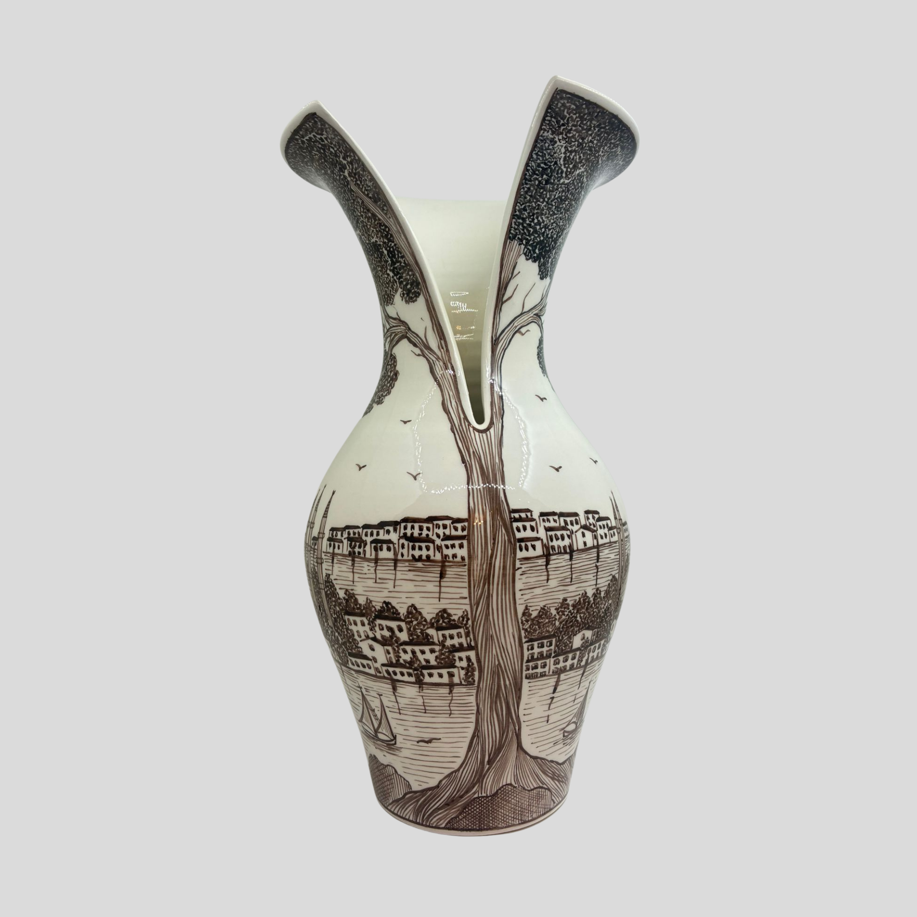 Seramik çini yüzey üzerine işlenen detaylı İstanbul tasviri, ürüne hem kültürel hem de sanatsal bir derinlik kazandırır. Kahverengi tonlar, doğallığı ve sıcaklığı yansıtırken; formundaki akışkanlık mekâna estetik bir hareket katar.