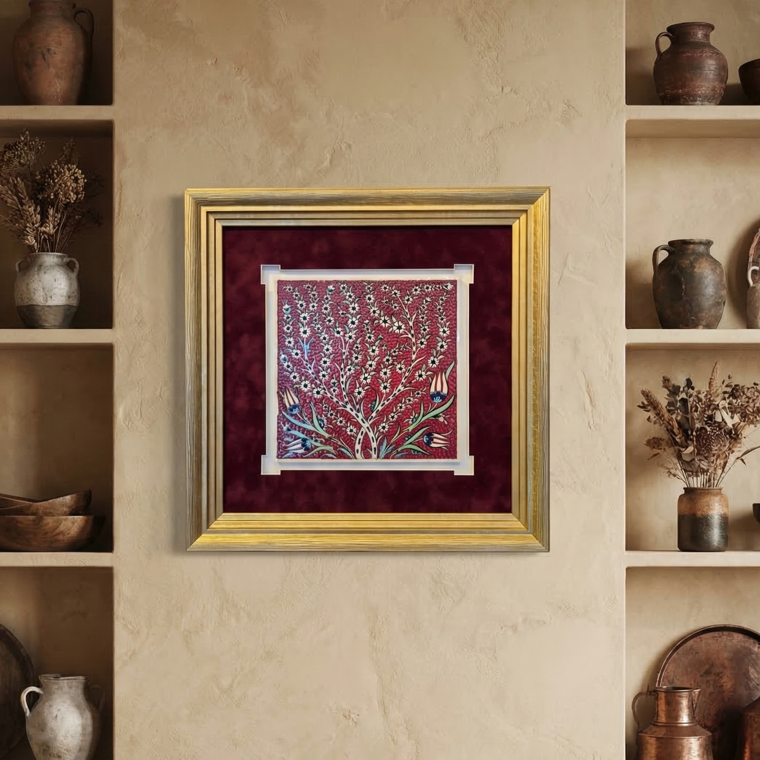 Hayat Ağacı Seramik Karo Çerçeve Seramik karo yüzey üzerine işlenen bu desen, bordo kadife fon ve altın tonlu çerçeve ile bir araya gelerek esere güçlü bir görsel derinlik kazandırır.Hayat Ağacı Seramik Karo Çerçeve Geleneksel motiflerin modern dekorasyonla buluştuğu bu tasarım; ev, ofis ve koleksiyon alanları için prestijli bir dekoratif üründür.