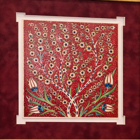 Hayat Ağacı Seramik Karo Çerçeve Kırmızı zemin üzerinde yükselen hayat ağacı; çiçekler, tomurcuklar ve ince dallarla zenginleşerek estetik bir bahçe kompozisyonuna dönüşür. Kompozisyonun alt bölümünde yer alan lale ve bitkisel motifler ise Osmanlı süsleme sanatının klasik zarafetini yansıtır.
