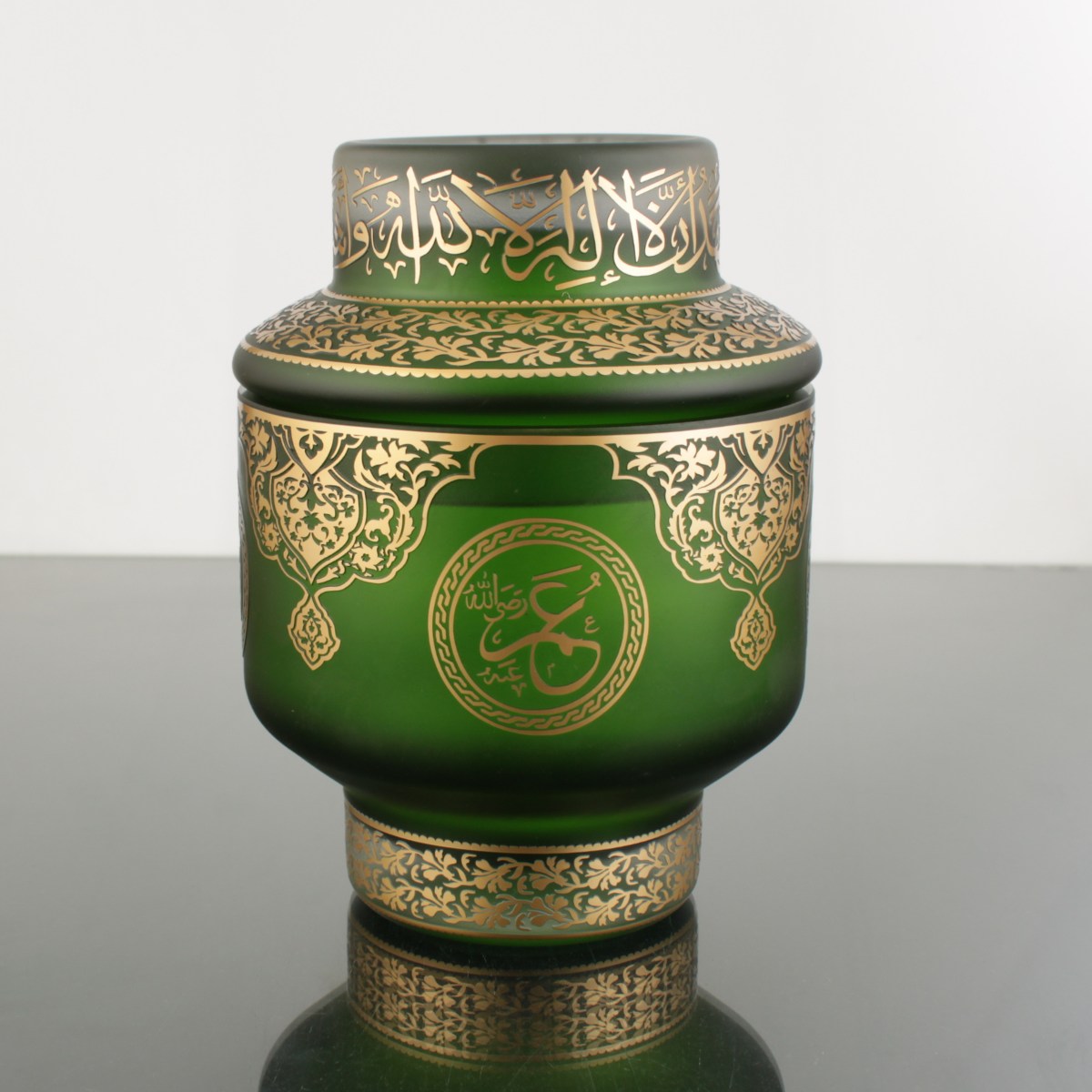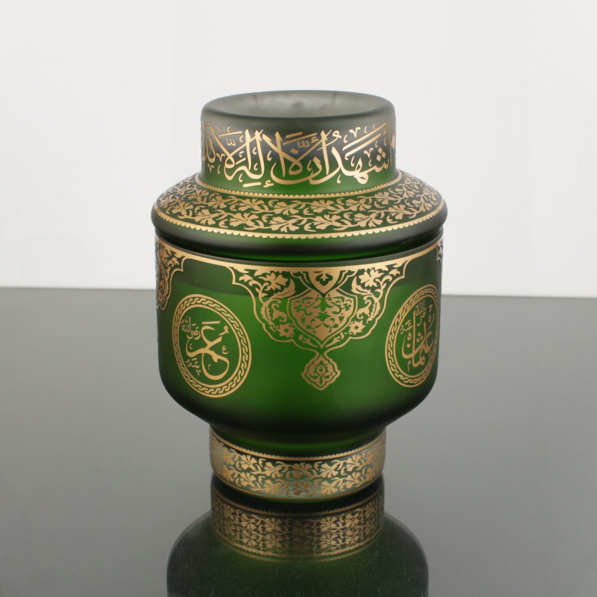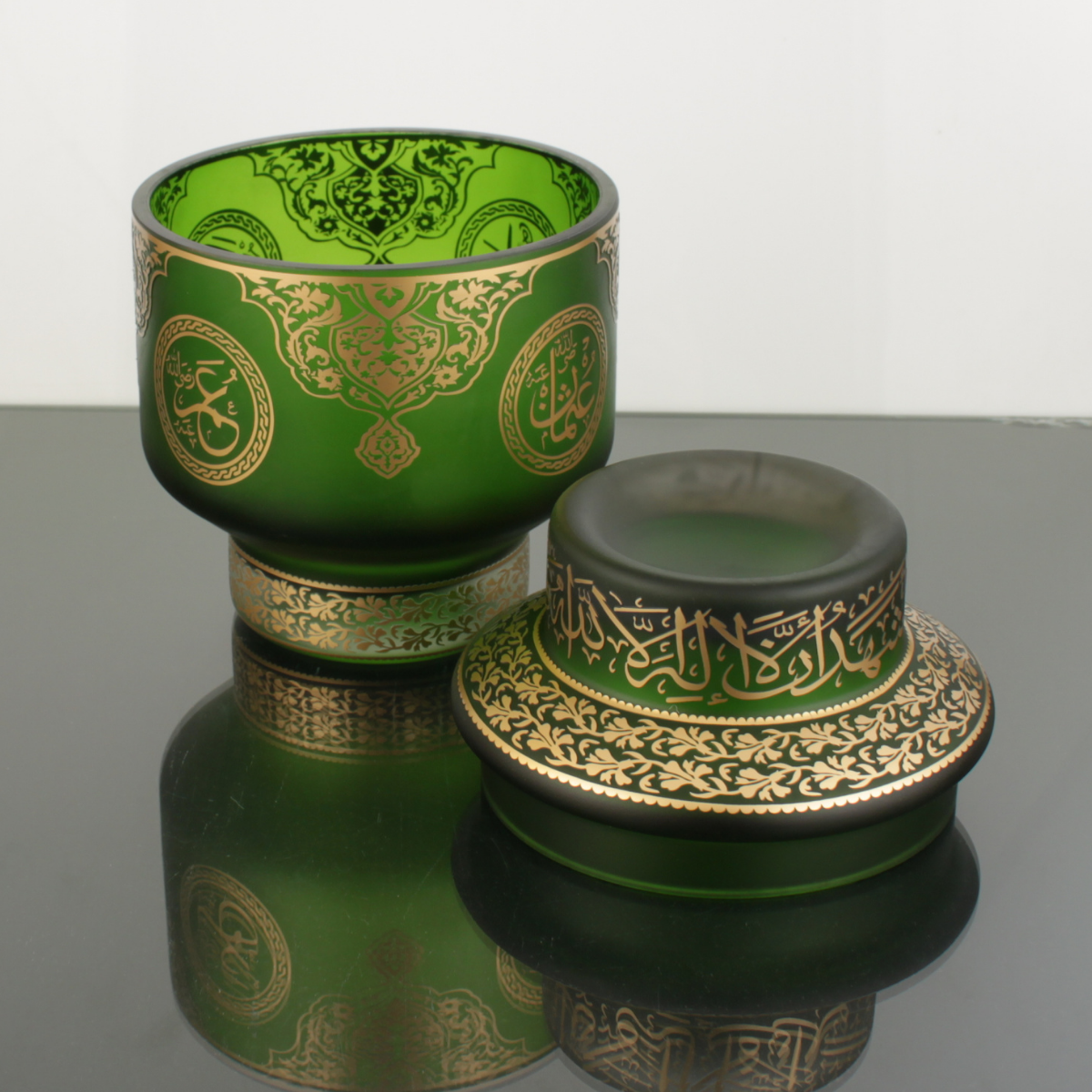 Hilafet Şekerlik Yeşil ; “Hilafet” kavramının taşıdığı yüksek temsil gücünden ve Hulefâ-yi Râşidîn’in kutlu mirasından ilham alarak tasarlanmıştır. Cam form üzerine Kelime-i Tevhid ve Hz. Ebubekir, Hz. Ömer, Hz. Osman, Hz. Ali isimleri; geleneksel motiflerle birlikte el işçiliğiyle işlenir.