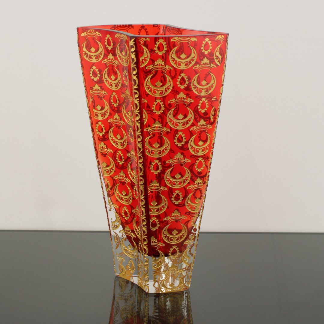 Hilal Vazo, İslam sanatının ve Osmanlı estetiğinin güçlü sembollerinden olan hilal motifinden ilham alarak tasarlanmıştır. Kırmızı zemin üzerine ustalıkla işlenen hilal desenleri, camın doğal şeffaflığıyla kontrast oluşturarak etkileyici bir görsellik sunar.