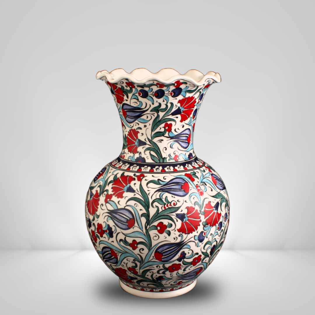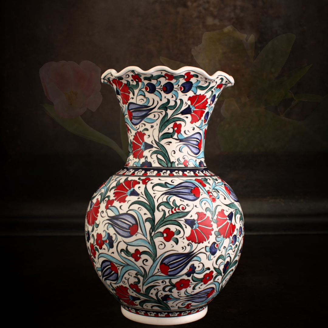 Baharın canlılığını ve Osmanlı çini estetiğini bir araya getiren el yapımı Hüsn-i Bahar Vazo, yaşam alanlarınıza zarafet ve anlam katar.