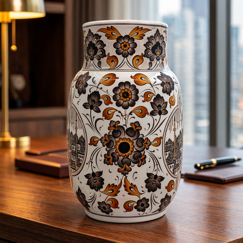 Ahşap masa ve konsol üzerinde daha sıcak ve prestijli görünür; gün ışığında desen kuşağı daha net okunur. Kütüphane önünde “entelektüel” bir köşe etkisi oluşturur, yönetici odasında ise tek parça ile güçlü bir temsil dili kurar. Etrafında kalabalık aksesuar istemez; tek başına yeterince odaktır.